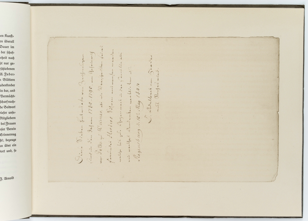 - Description: With accompanying text in original cardboard binding “This publication, printed at the Graphische Lehr= und Versuchsanstalt (Bundesanstalt) in Vienna, is dedicated by the Vienna Goethe=Verein to its members and patrons for the year 1932 in three hundred counted and hand-numbered pieces. This is number 256”. Four drawings by Johann Wolfgang von Goethe and a facsimile letter. The drawings show Arcadian or Italian landscapes and were probably made during the poet’s trip to Italy. Sheet 1 shows the ruins of the Temple of Hercules.