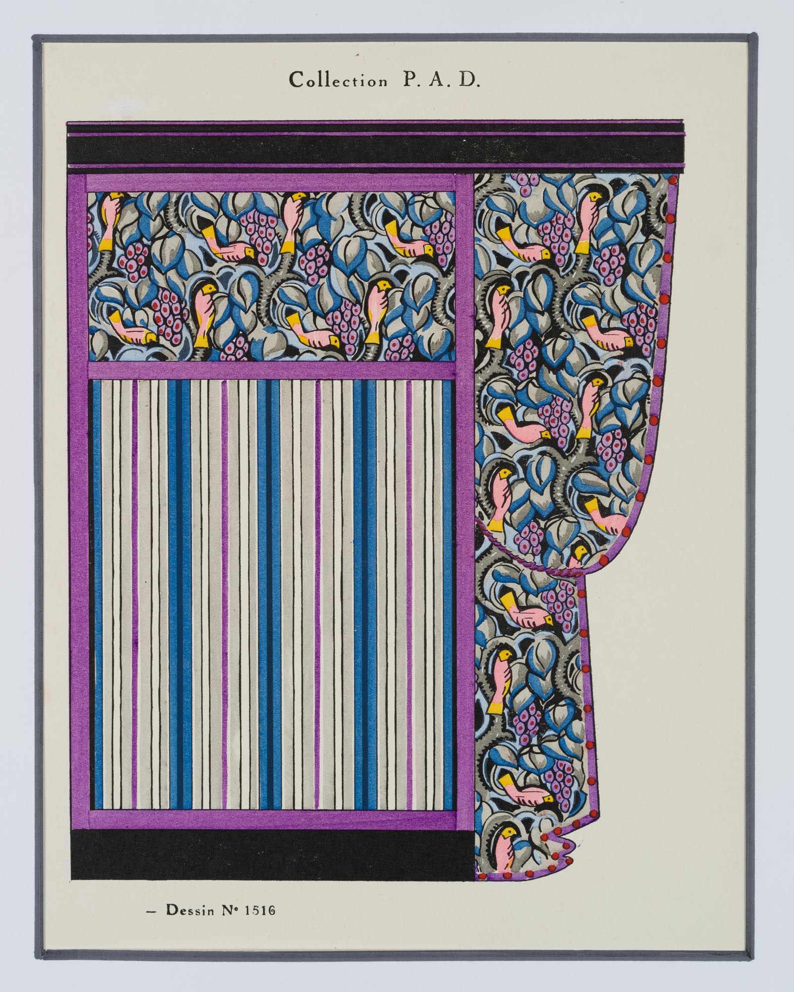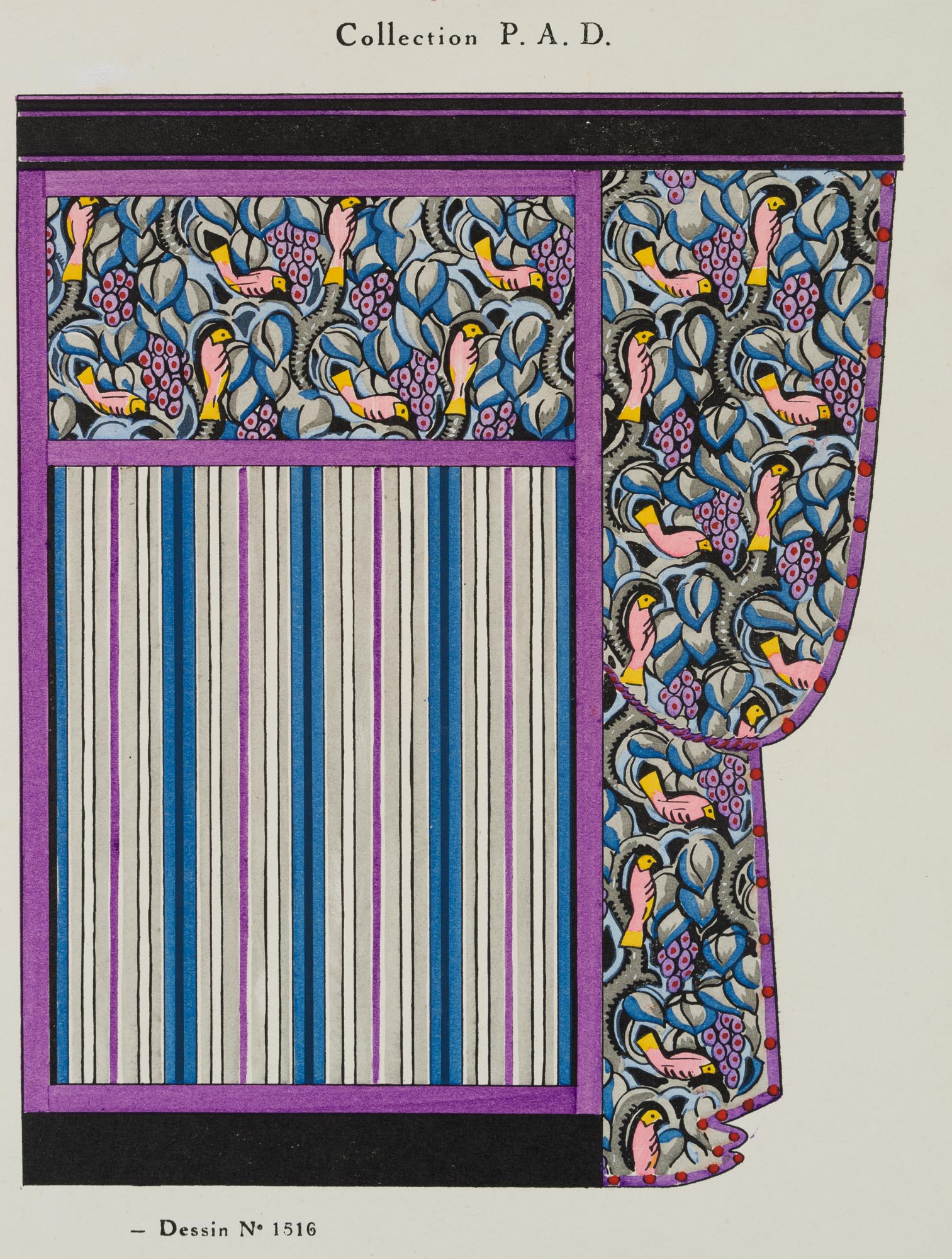 Unbekannt (20. Jahrhundert), Vorhangdesign, Design-Entwürfe für TOLMER, ETUDE POUR TAPISSERIE, „Collection P.A.D.“, „Dessin No. 1516“, 1920, Lithographie