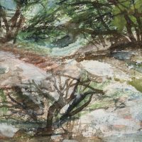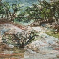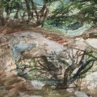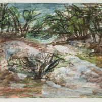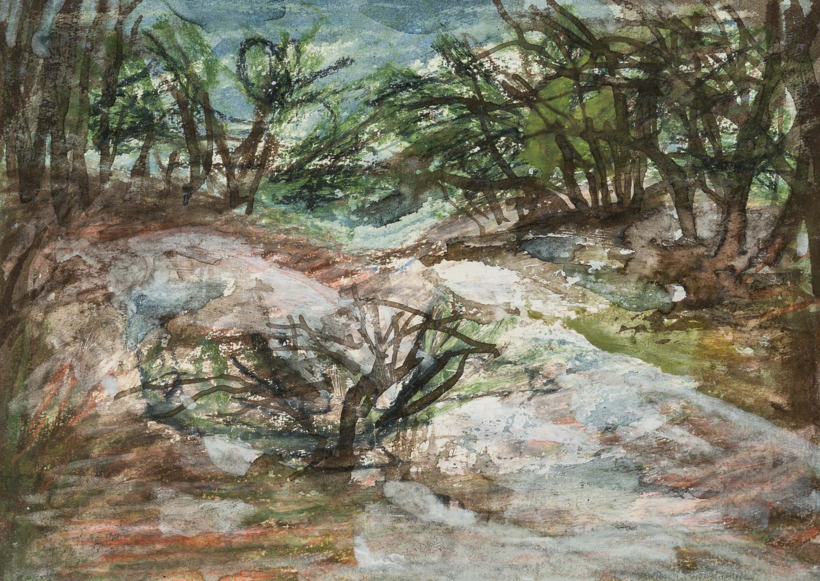 - Beschreibung: Dieses erdig grüne Landschaftsbild hat einen expressiven Charakter. Die wilde Vegetation des Waldes löst sich in den gestischen Pinselstrichen auf. Ein Pfad vielleicht auch ein Flusslauf lässt sich erkennen. Dieser Verläuft diagonal hinein ins Bild. In der Tiefe eröffnet sich über den Baumwipfeln ein blauer Himmel.