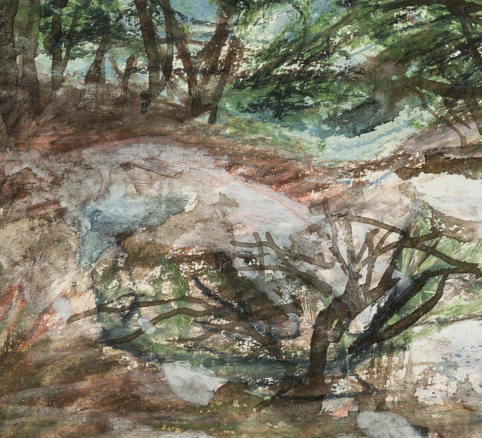 - Description: This earthy green landscape painting has an expressive character. The wild vegetation of the forest dissolves in the gestural brushstrokes. A path, perhaps even a river, can be discerned. This runs diagonally into the picture. In the depths, a blue sky opens up above the treetops.