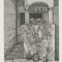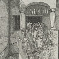 - Description: Finely drawn etching of a neo-classical house entrance with a small staircase. In front of it are oleanders or rose laurels in pots of various sizes.