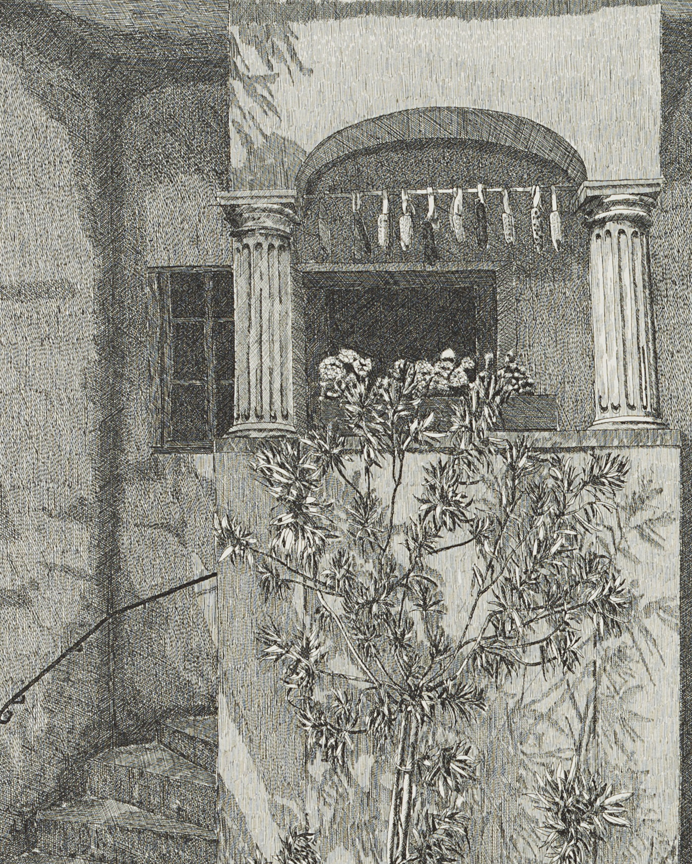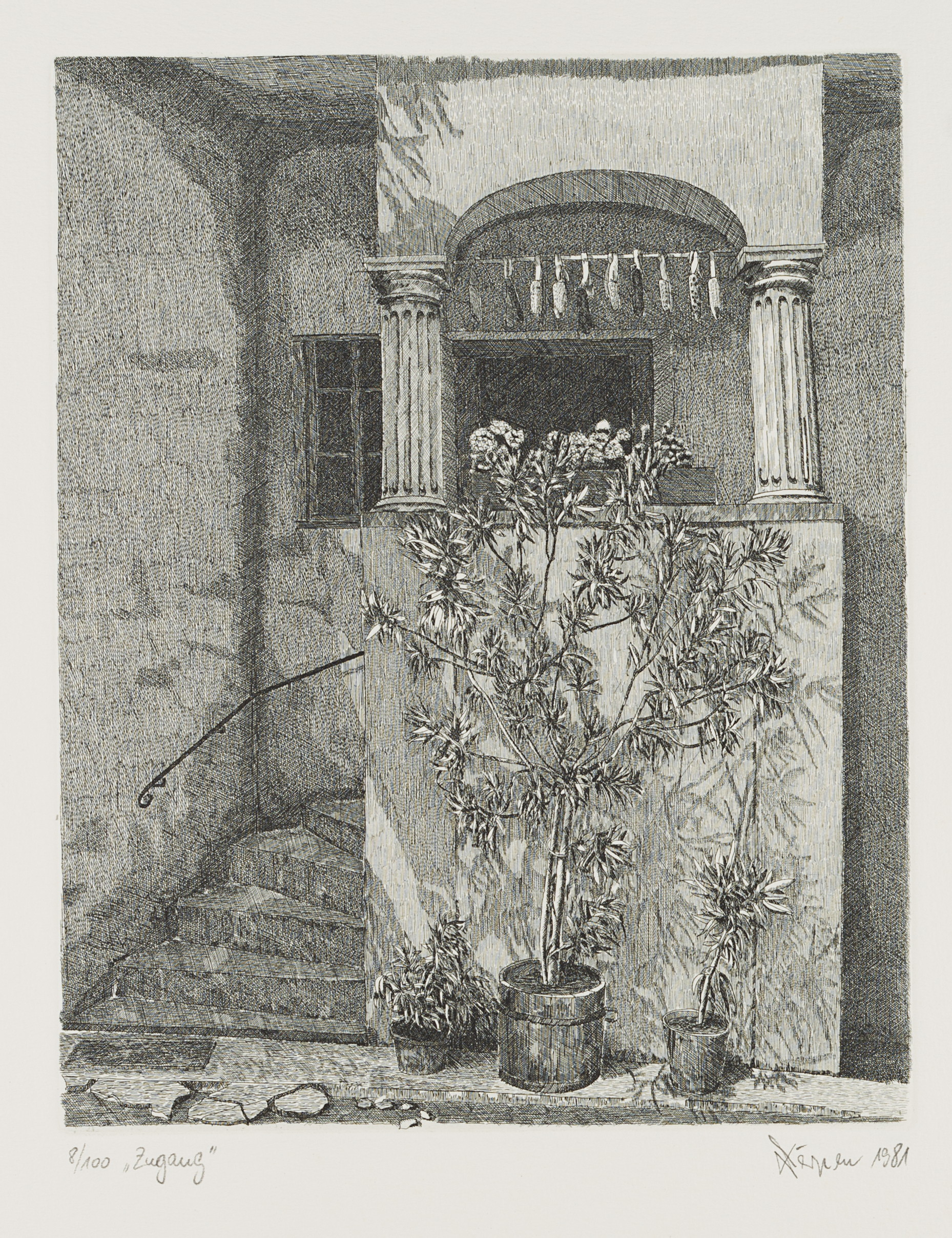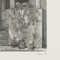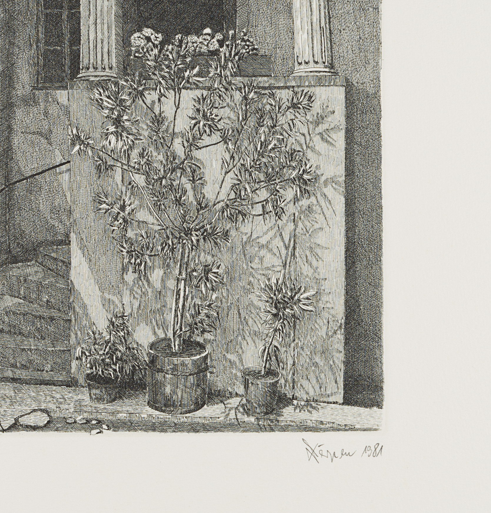 Unbekannt (20. Jahrhundert), Zugang, Oleander an klassizistischer Eingangstreppe, 1981, Radierung