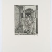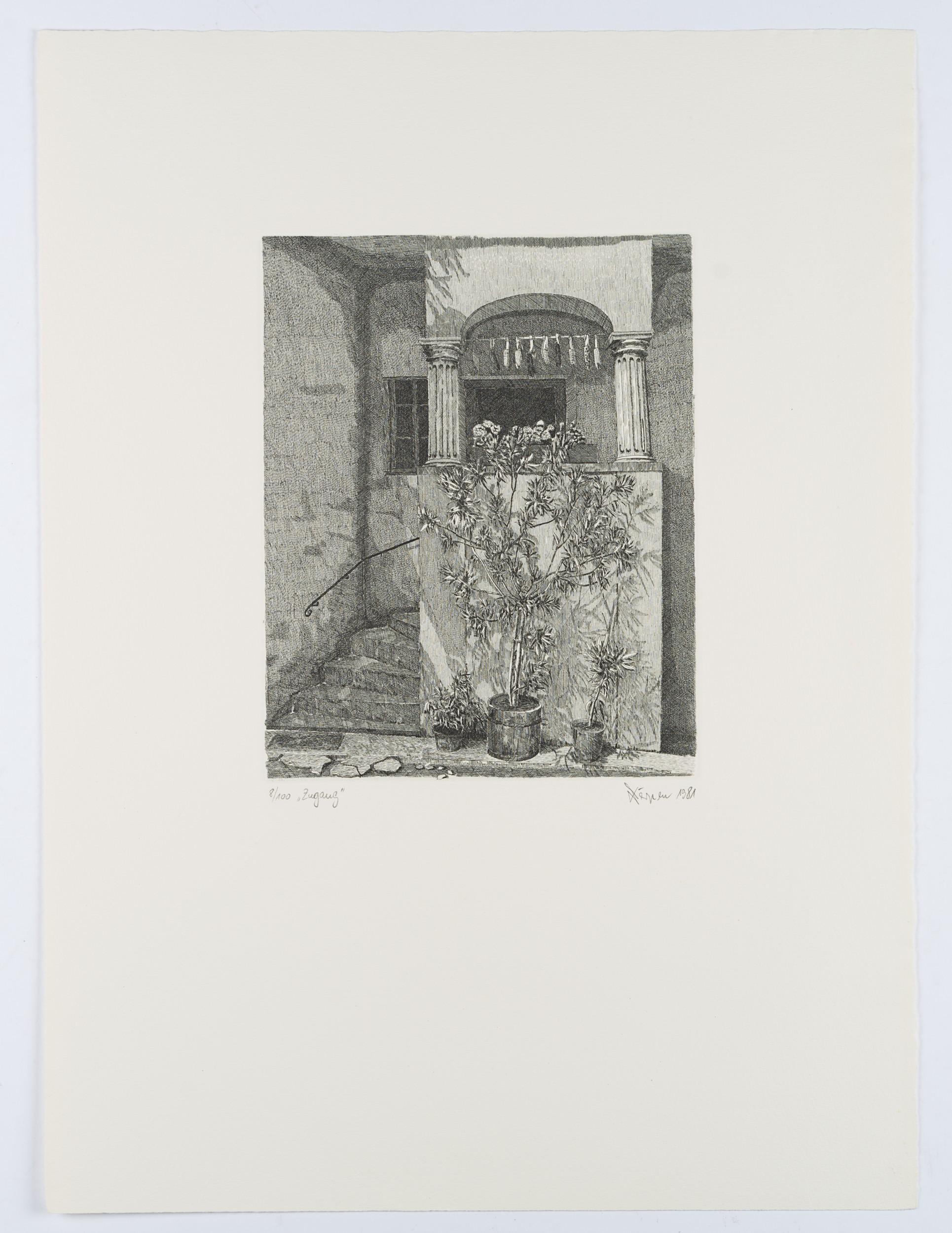 - Beschreibung: Fein gezeichnete Radierung eines klassizistischen Hauseingangs mit kleiner Eingangstreppe. Davor stehen in verschieden großen Töpfen Oleander oder Rosenlorbeer.