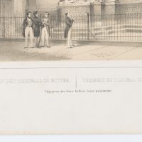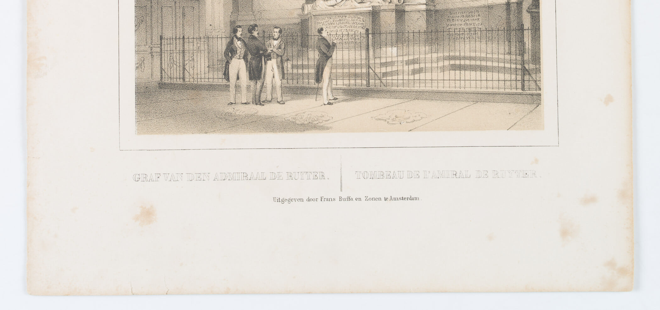 - Inscription: Lower middle inscribed in the printing plate: “Graf van den Admiraal de Ruyter | Tombeau de l’amiral de Ruyter”.