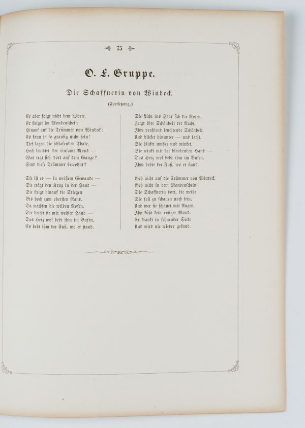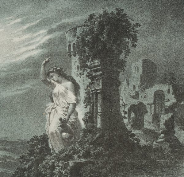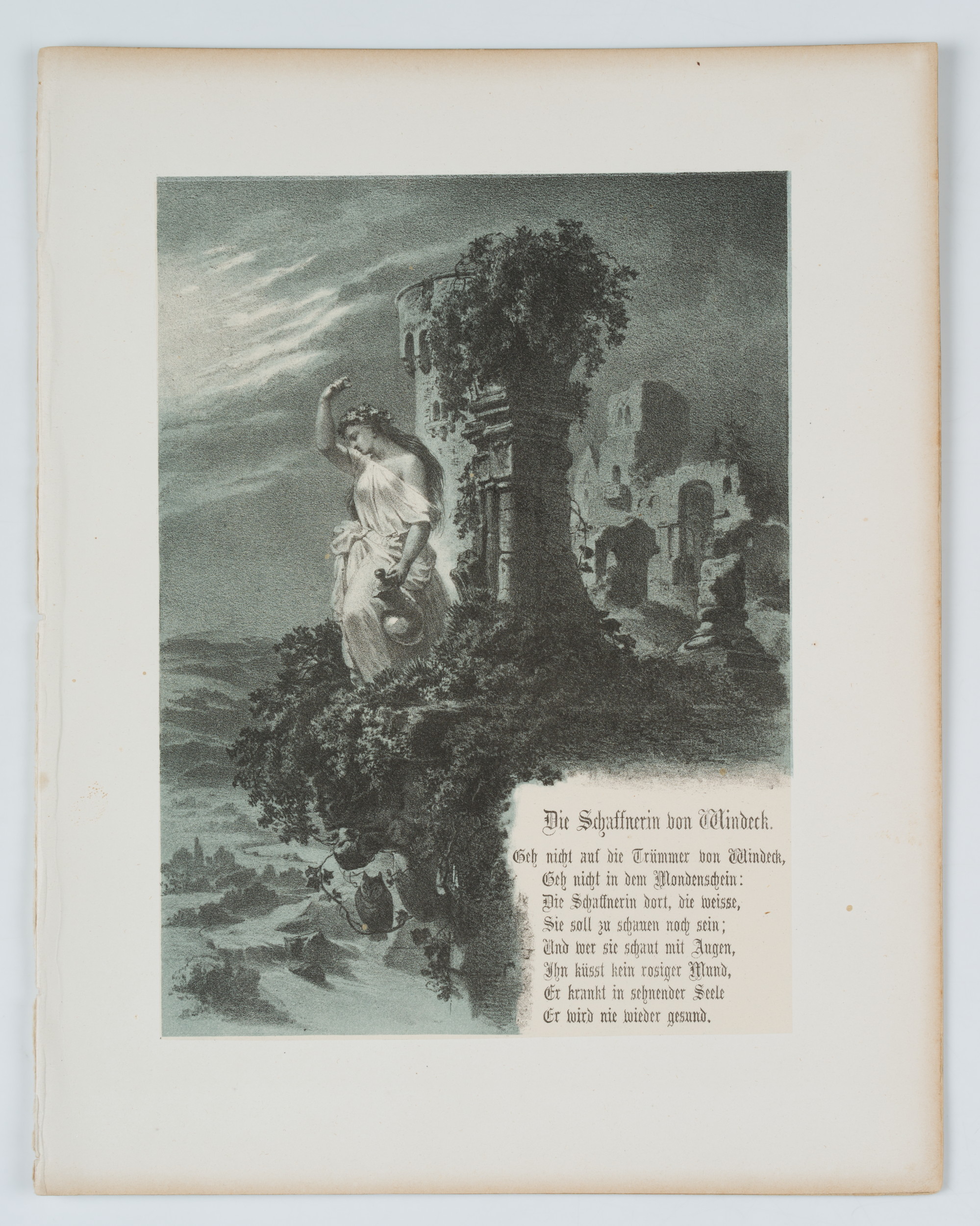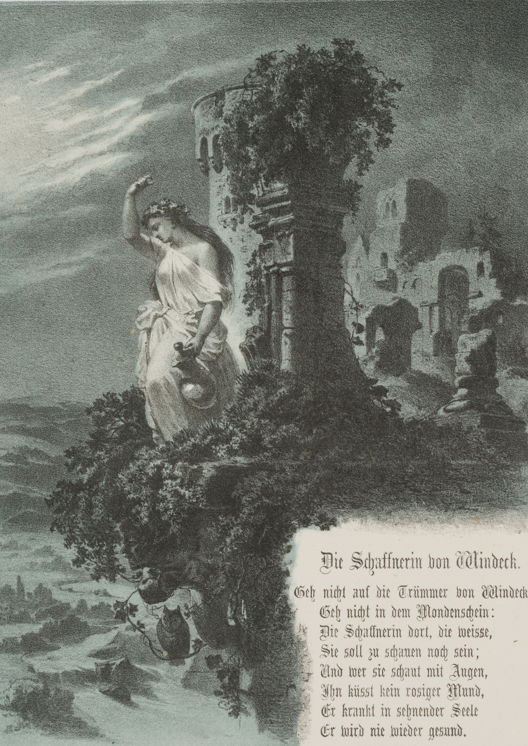 - Inscription: Lower right inscribed in the printing plate: “Die Schaffnerin von Windeck. Seh nicht auf die Trümmer von Windeck, Seh nicht in dem Mondenschein: […]”.