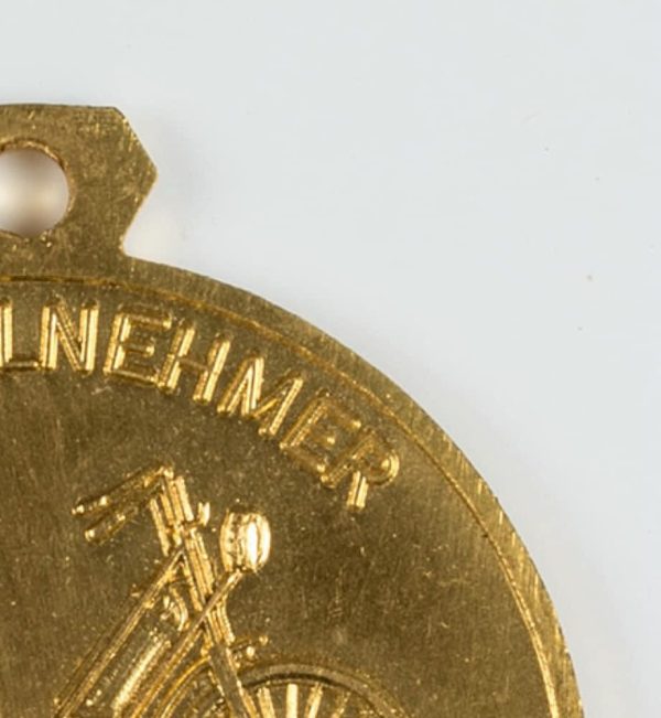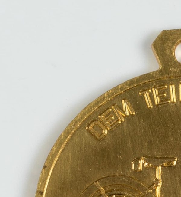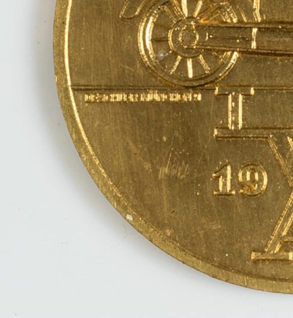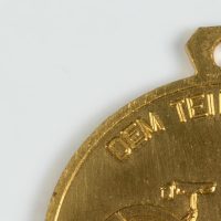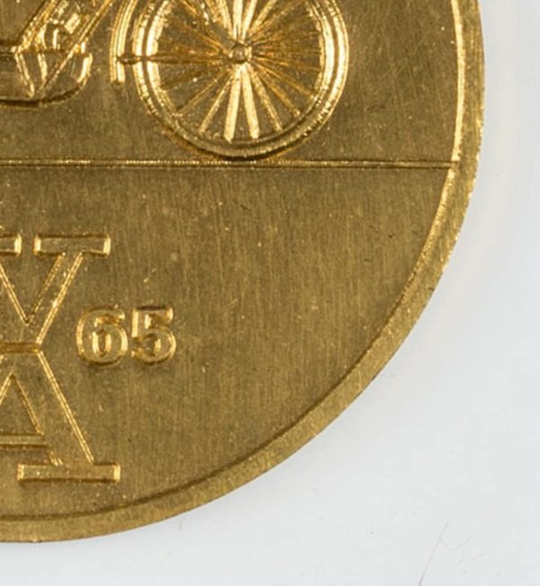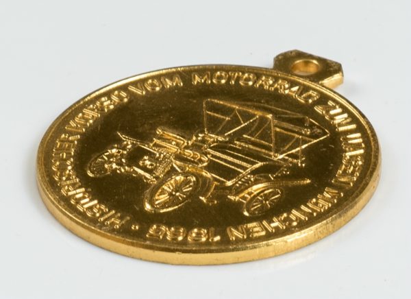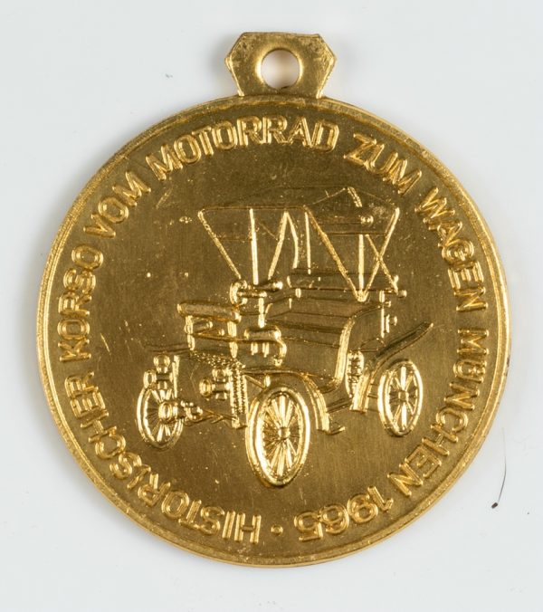 - Description: Gold-plated coin with eyelet for hanging. Commemorating participation in „Historischer Korso vom Motorrad zum Wagen München 1965“ with depiction of a vintage car. On the reverse is a moped with the inscription „Dem Teilnehmer | LVA 1965“.