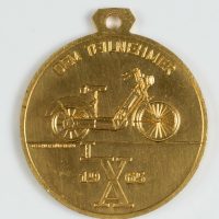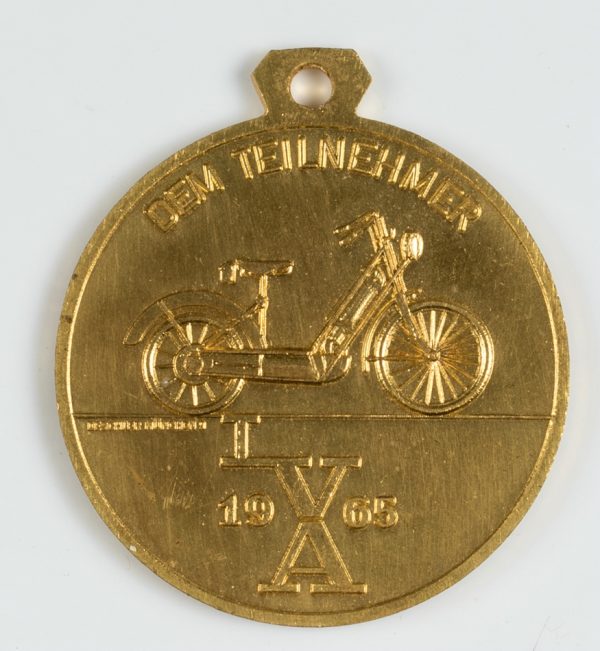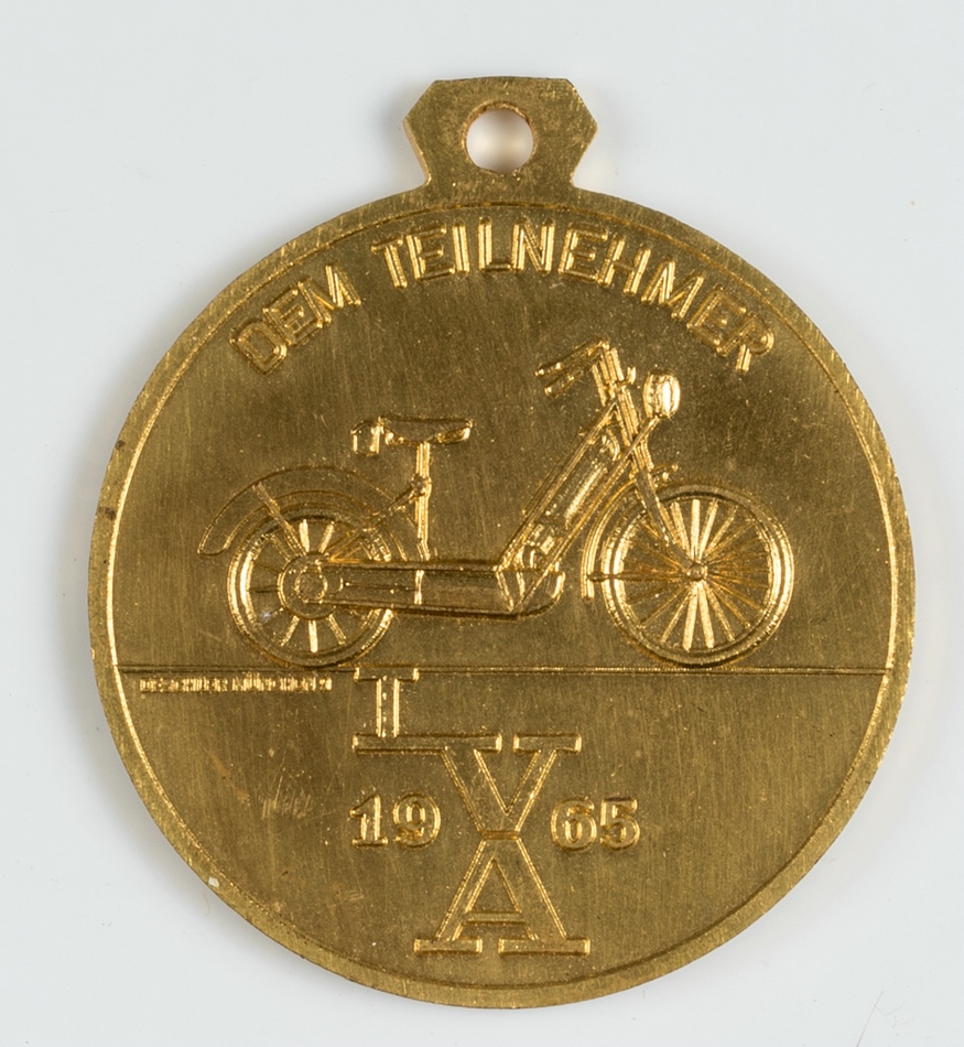 - Beschreibung: Vergoldete Münze mit Öse zum Anhängen. Erinnerung an die Teilnahme an „Historischer Korso vom Motorrad zum Wagen München 1965“ mit Darstellung eines Oldtimers. Rückseitig ist ein Mofa zu sehen mit der Inschrift „Dem Teilnehmer | LVA 1965“.