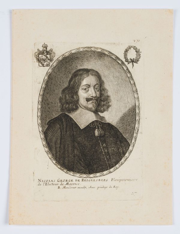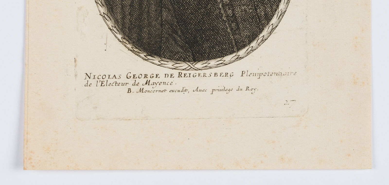 - Bezeichnung: Unten in der Platte beschriftet und nummeriert mit “NICOLAS GEORGE DE REIGERSBERG Plenipotentiaire de l’Electeur de Mayence.; B. Moncornet excudit, Auec priuilege du Roy.; 27”.