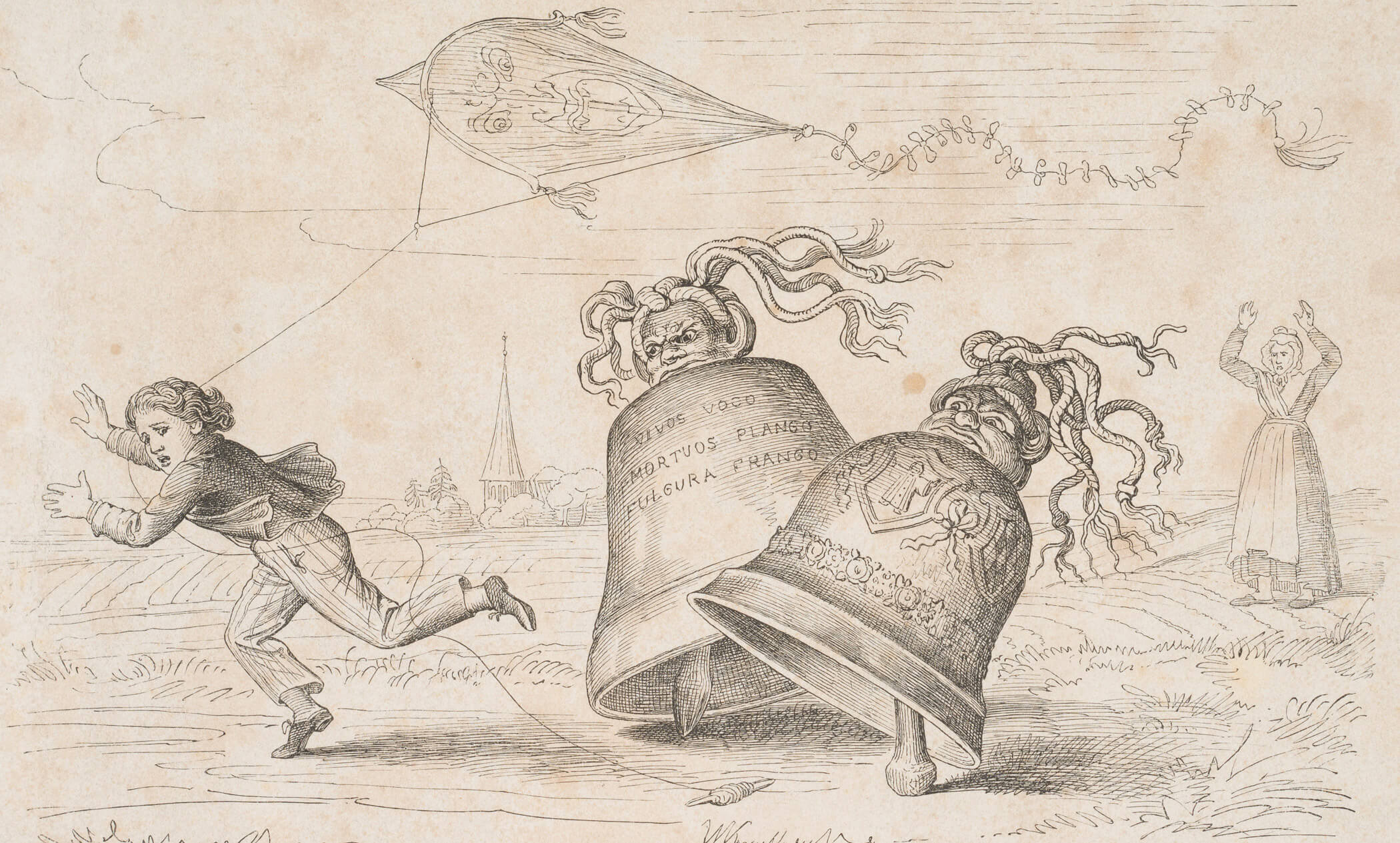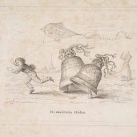 - Beschreibung: Zwei Glocken haben sich vom Kirchturm losgerissen und jagen einen erschrockenen Jungen über das Feld