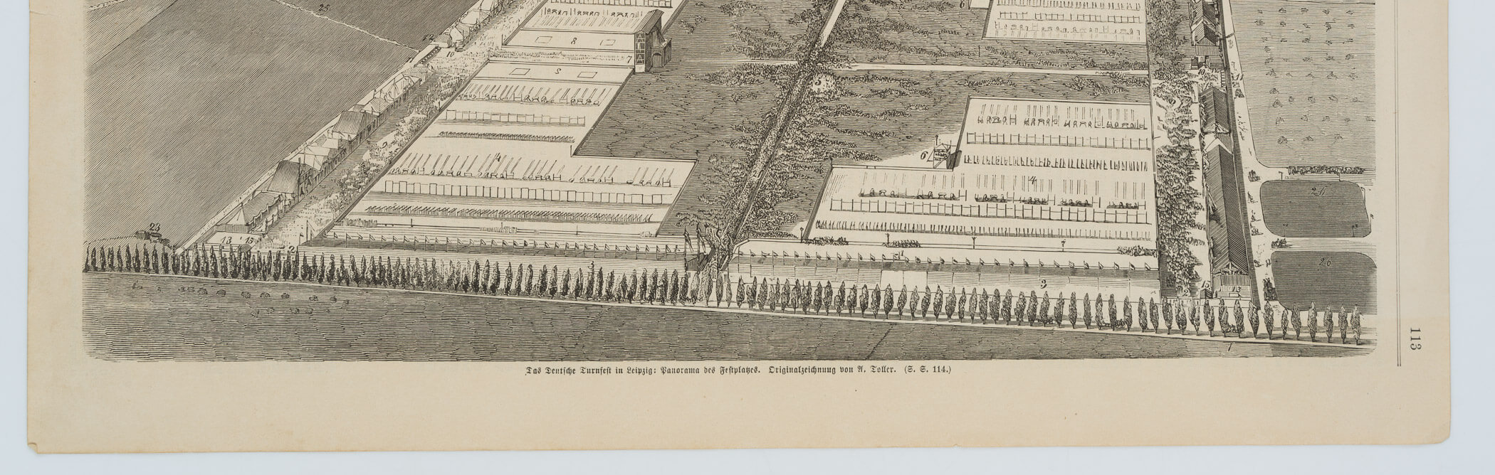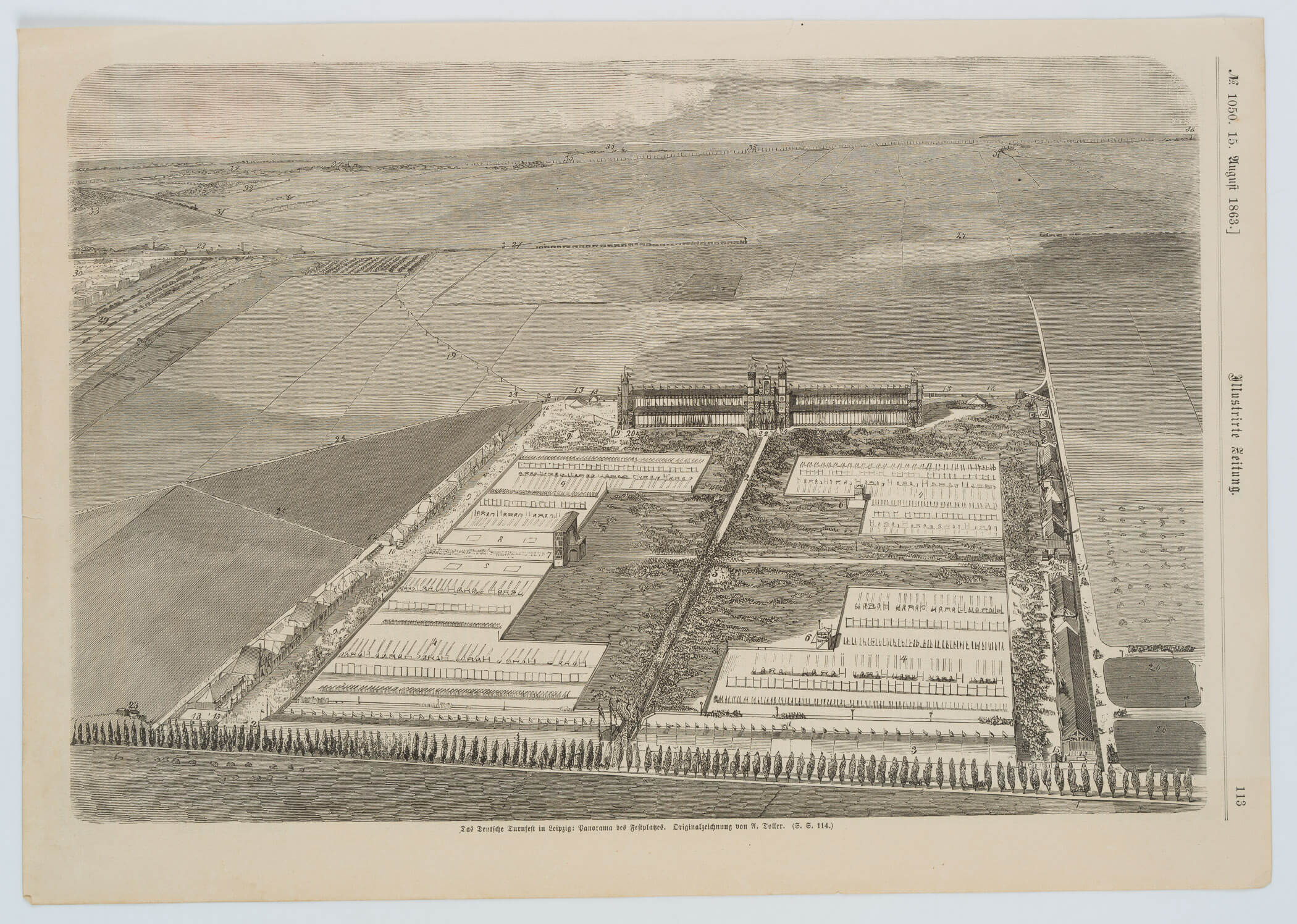 • Schlagworte: Illustrirte Zeitung, Holzschnittkünstler, Zeitschrift, Deutsches Turnfest, Allgemeines Deutsches Turnfest 1863, Völkerschlacht, Turner, Sport, Architektur, Deutschland, Realismus, 1850-1899