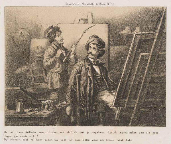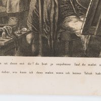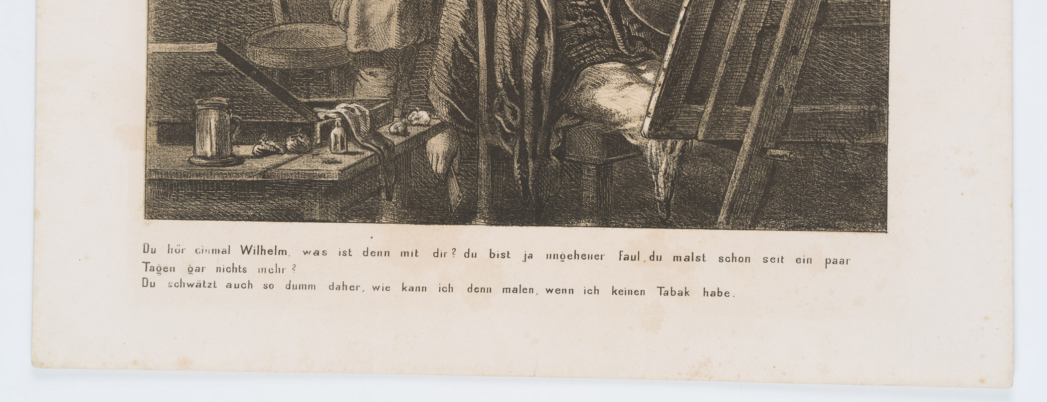 - Inscription: Lower middle inscribed in the printing plate: “Du hör einmal Wilhelm, was ist denn mit dir? du bist ja ungeheuer faul, malst schon seit ein paar Tagen nichts mehr? […]”.