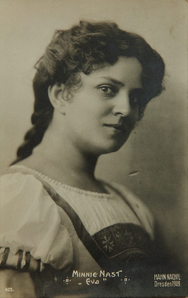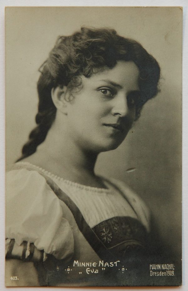 Minnie Nast zählt zu den großen deutschen Opernsängerinnen des frühen 20. Jahrhunderts. Nach ihrem musikalischen Studium am Badischen Konservatorium in Karlsruhe machte sie ihr gesangliches Debüt 1897 in Aachen. Sie begann eine erfolgreiche Karriere, die sie unter anderem auf die Bühnen in Kanada, den Vereinigten Staaten von Amerika, Russland, den Niederlanden und Großbritannien führte. Bis 1919 sang die Sopranistin regelmäßig in der Semperoper zu Dresden. Danach lehrte sie bis 1945 Gesang in Dresden. Minnie Nast ist für ihre munteren und leichten Verkörperungen von Soubrettenrollen, vor allem in Mozart-Opern, bekannt. Eine herausragende Leistung erwies sie am 26. Januar 1911 als sie bei der Uraufführung von Richard Strauss’ Der Rosenkavalier die Rolle der Sophie sang. Durch erhaltene Tonaufnahmen kann man noch heute ihre klare und bezaubernde Stimme erleben.