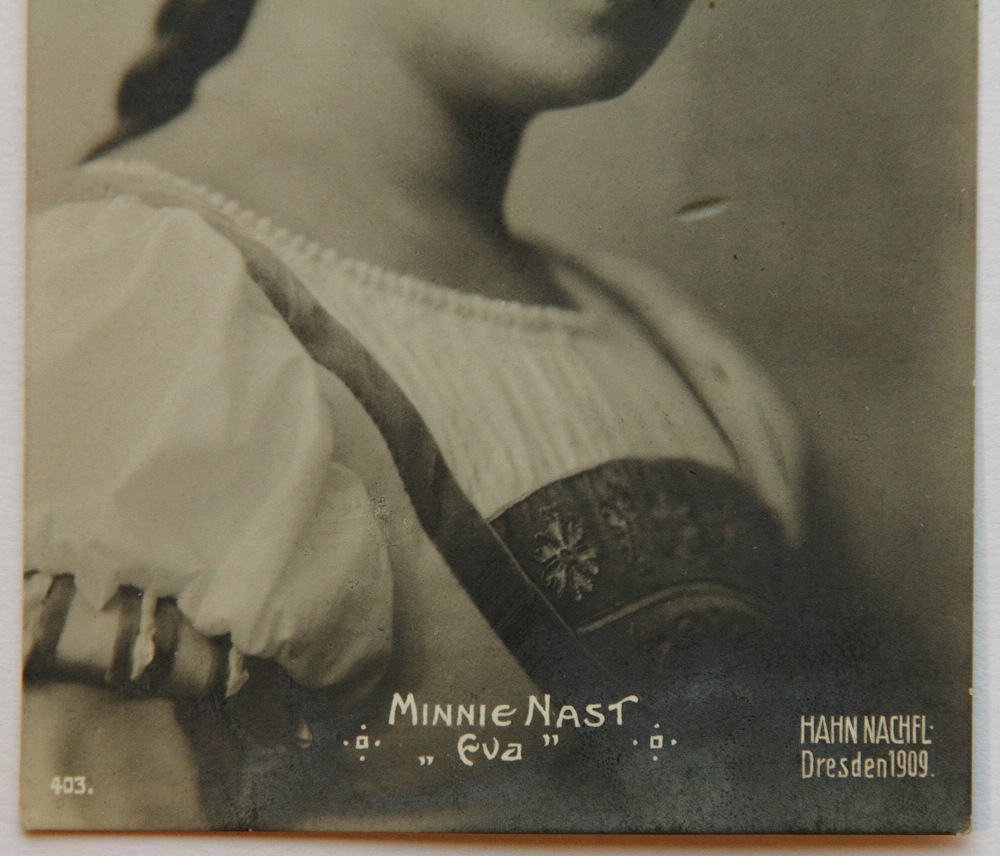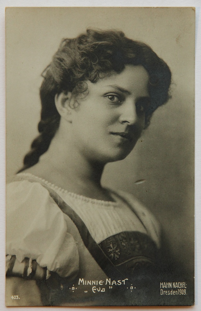 Fototiefdruck auf festem Papier als Postkarte. Brustbild im Dreiviertelprofil. Die Dargestellte trägt ihr Haar zum Zopf geflochten und ein trachtenähnliches Kleid. Minnie Nast zählt zu den großen deutschen Opernsängerinnen des frühen 20. Jahrhunderts. Nach ihrem musikalischen Studium am Badischen Konservatorium in Karlsruhe machte sie ihr gesangliches Debüt 1897 in Aachen. Sie begann eine erfolgreiche Karriere, die sie unter anderem auf die Bühnen in Kanada, den Vereinigten Staaten von Amerika, Russland, den Niederlanden und Großbritannien führte. Bis 1919 sang die Sopranistin regelmäßig in der Semperoper zu Dresden. Danach lehrte sie bis 1945 Gesang in Dresden. Minnie Nast ist für ihre munteren und leichten Verkörperungen von Soubrettenrollen, vor allem in Mozart-Opern, bekannt. Eine herausragende Leistung erwies sie am 26. Januar 1911 als sie bei der Uraufführung von Richard Strauss’ Der Rosenkavalier die Rolle der Sophie sang. Durch erhaltene Tonaufnahmen kann man noch heute ihre klare und bezaubernde Stimme erleben. Am unteren Darstellungsrand befindet sich der Name des Fotoateliers Hahn Nachfl. Dresden mit einer Datierung auf 1909. Darunter befindet sich die Nummerierung 403. Es handelt sich um eine Postkarte aus dem Verlag der Gebrüder Schelzel Dresden.