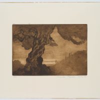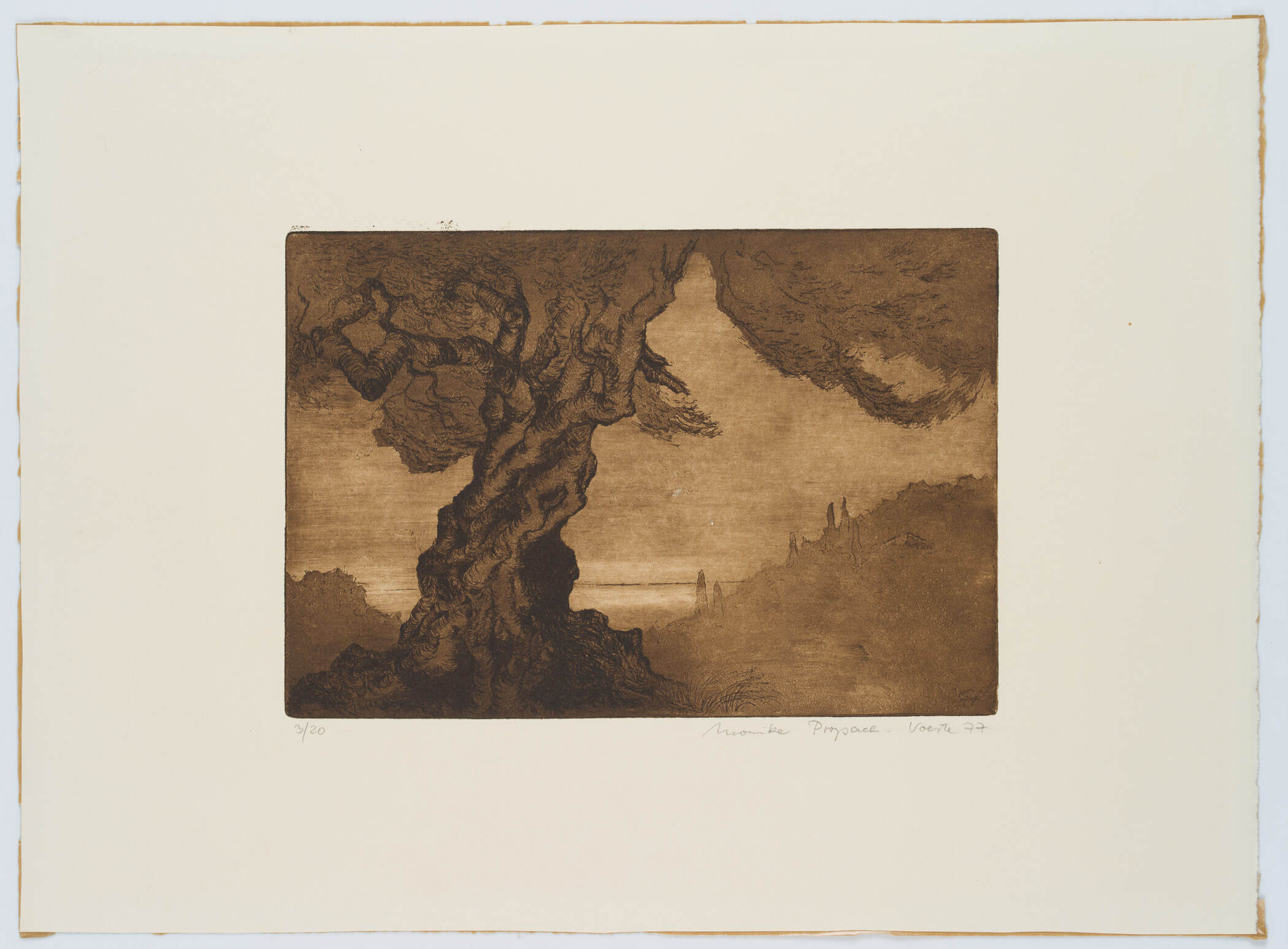 Unbekannt (20. Jahrhundert), PROPACH-VOESTE, Abstrakte Naturlandschaft mit Baum-Ungetüm, 1977, Radierung