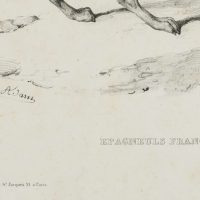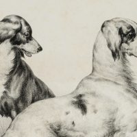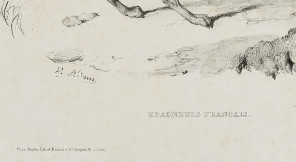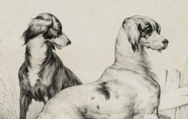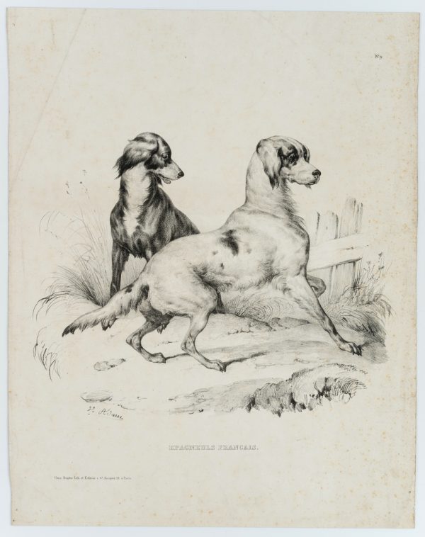 - Description: Large-format dog depiction with two French spaniel dogs in a landscape detail. Presumably from the series of the animal drawing school “Cours d’études d’animaux”.