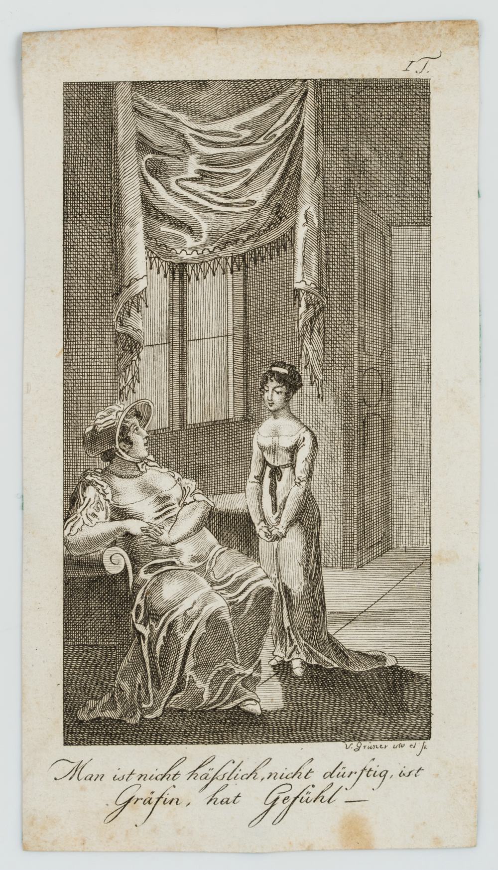 - Bezeichnung: Unterhalb in der Druckplatte signiert und bezeichnet mit: “Man ist nicht hässlich, nicht dürftig, ist Gräfin, hat Gefühl-“.