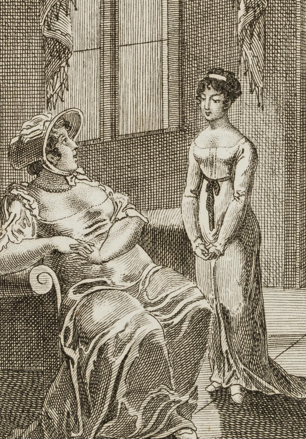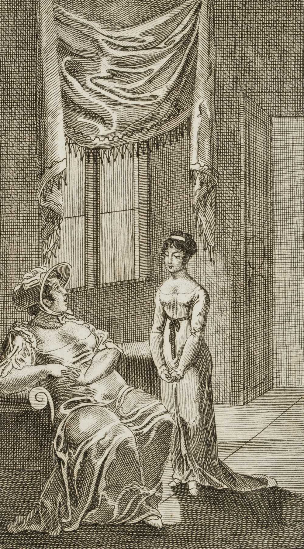 - Description: Miniaturised scene as illustration, probably to Lessing’s tragedy “Emilia Galotti”. Showing two ladies in Empire dresses in a hall, the sturdy one sitting and talking, the slimmer one standing and listening.