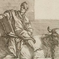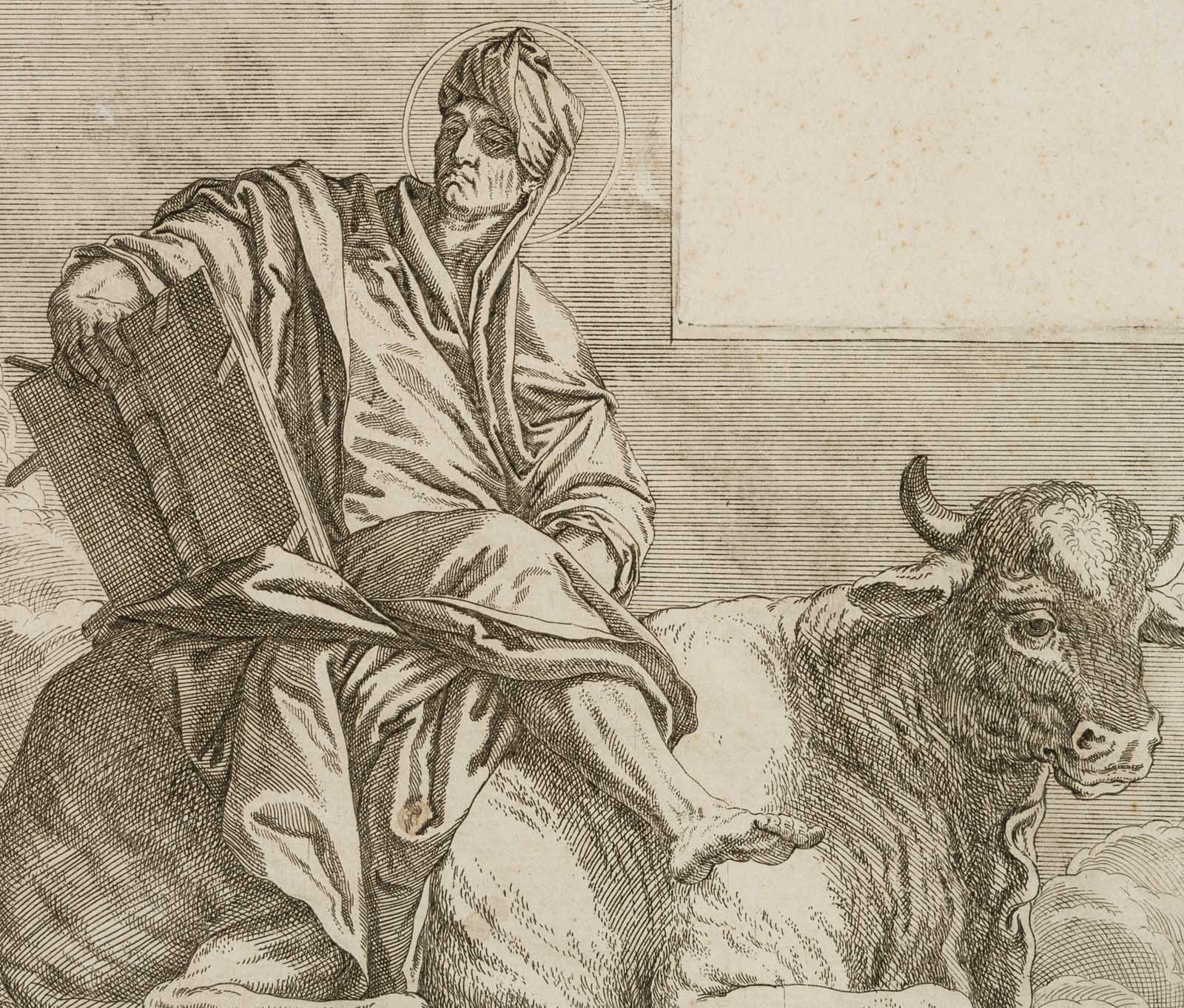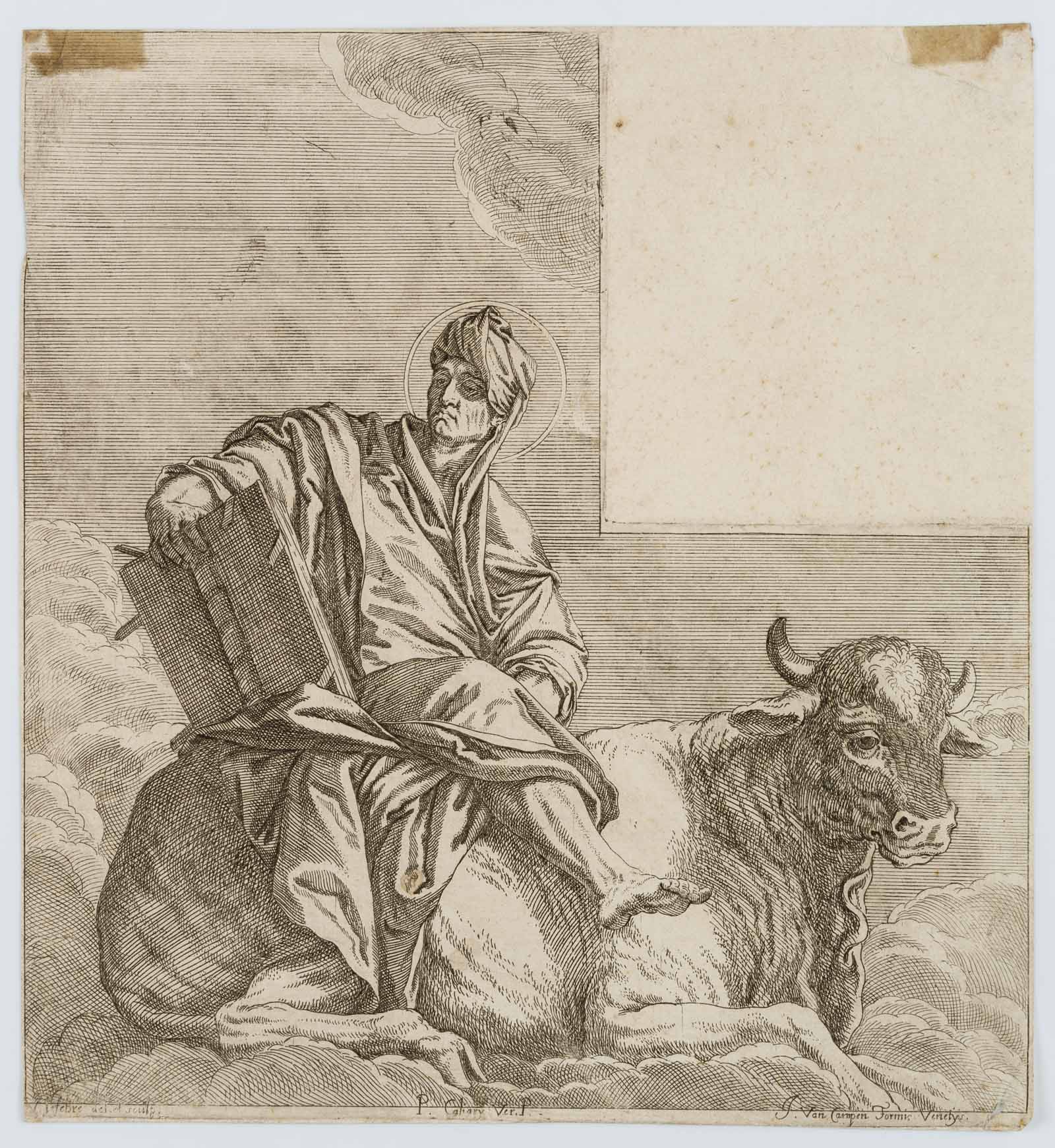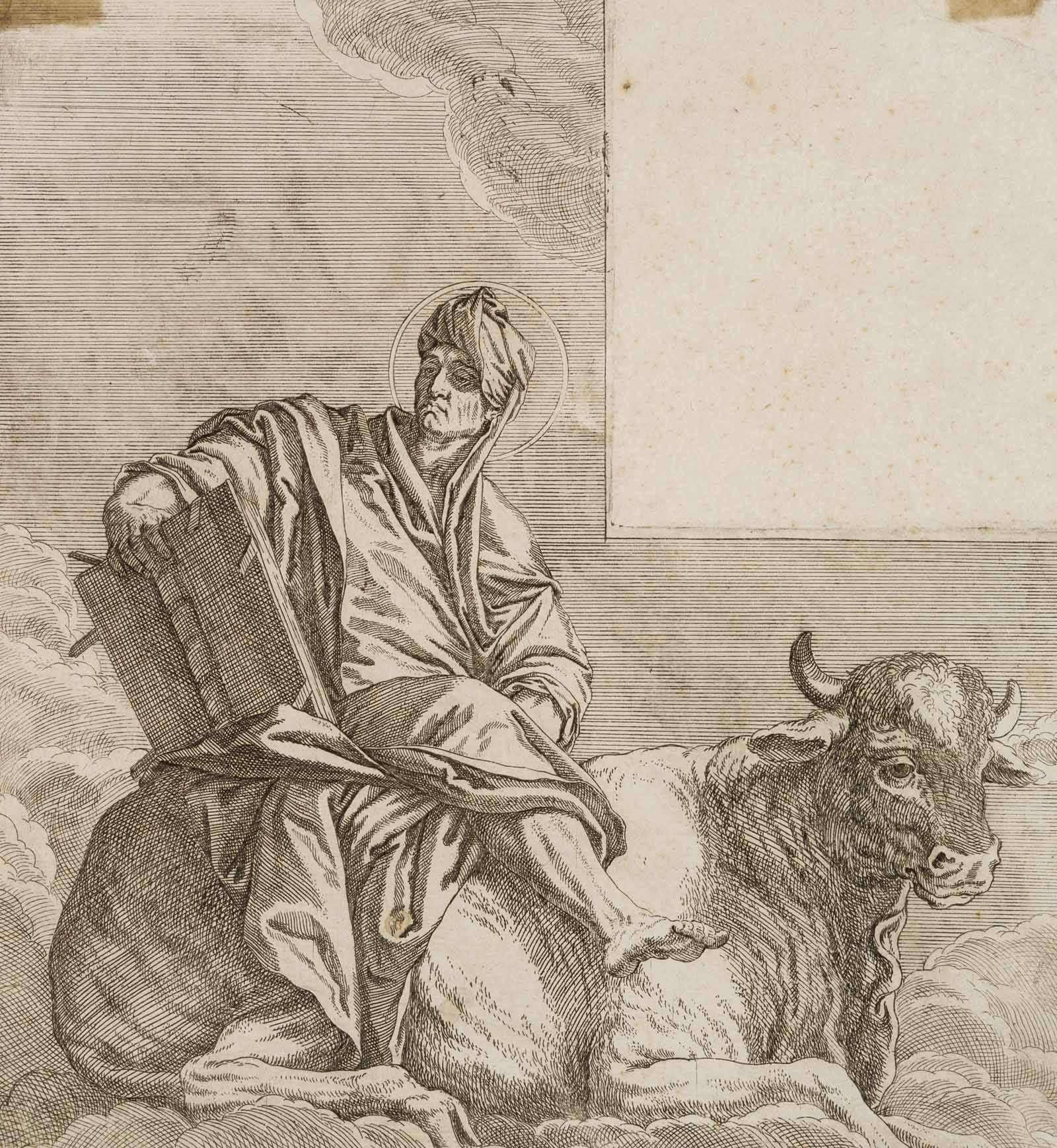 Valentin Lefebvre (1642 Brüssel – 1682 Venedig), Darstellung des Evangelisten Lukas mit Stier, Blatt aus der Folge “Opera Selectiora”, 1682, Radierung