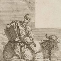 - Description: The print shows the evangelist Mark in classical antique garb. He is sitting on a bull and reading an open book. The print is part of the series “Opera Selectiora” etched by Valetin Levebvre. It is a 53-part print series based on paintings by Titian and Veronese. Jacob Van Campen first published the series in 1682.