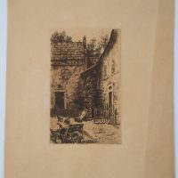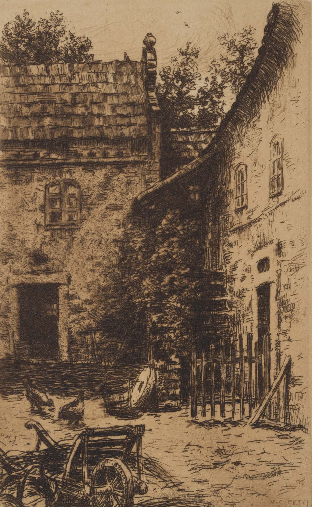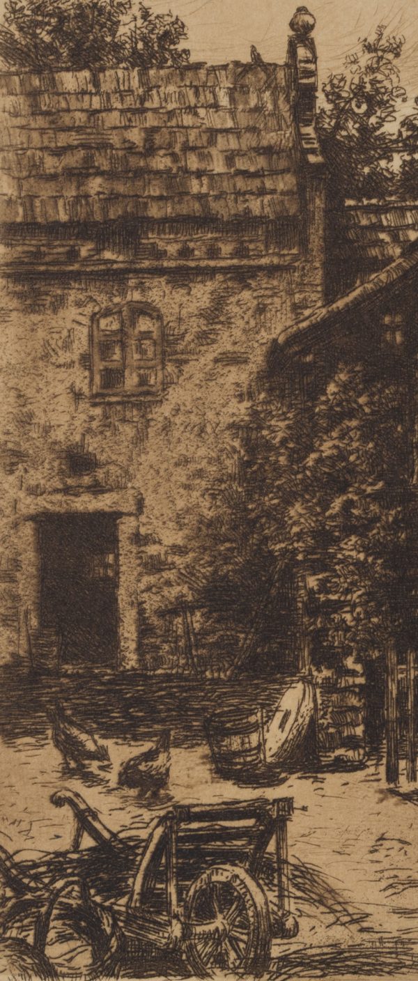 Viktor Strett (1878 – 1957 ), Blick in den Hof eines Bauernhofs mit Hühnern und landwirtschaftlichen Geräten, , Radierung