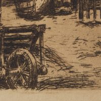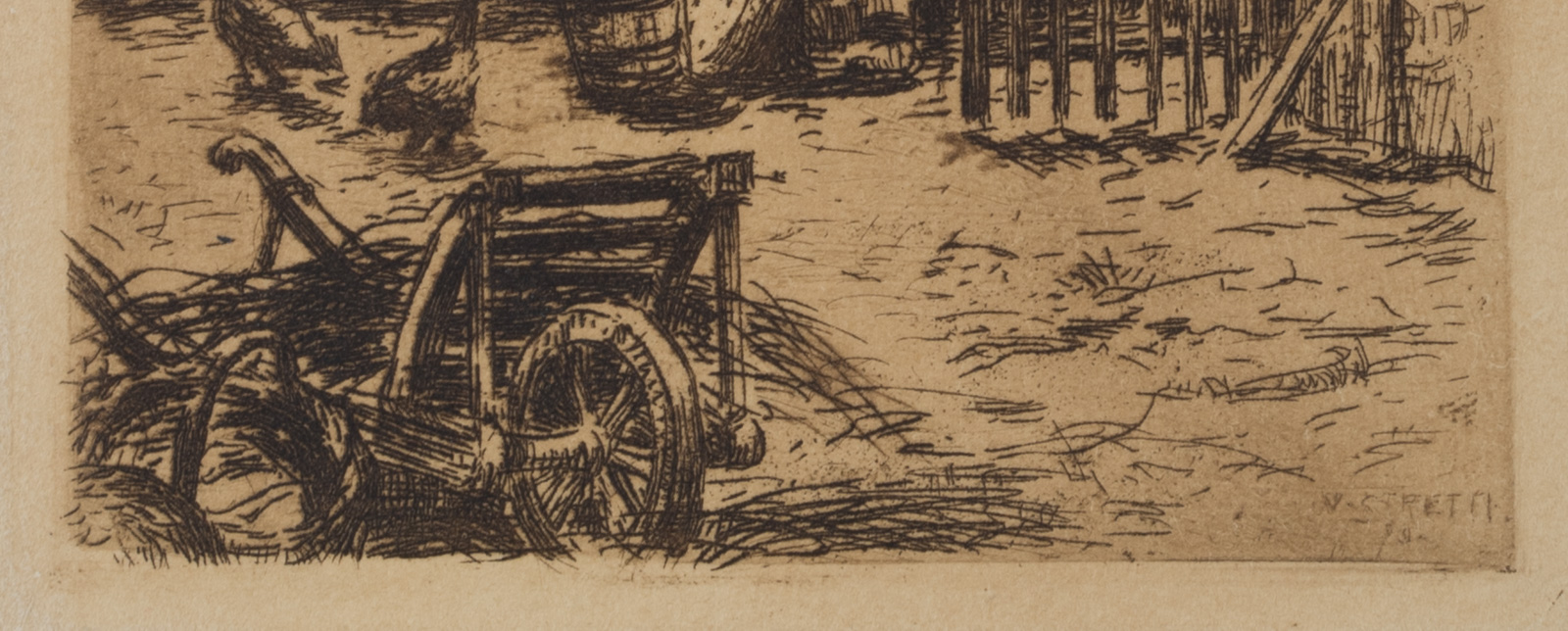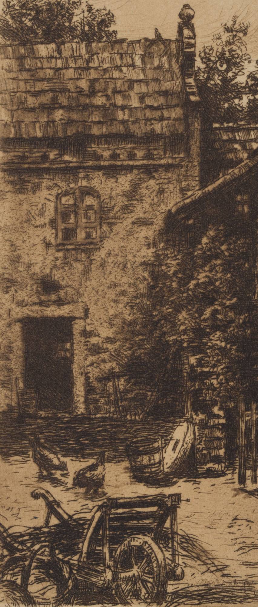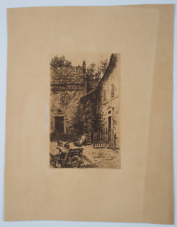 Viktor Strett (1878 – 1957 ), View into the yard of a farm with chickens and farm equipment, , Etching