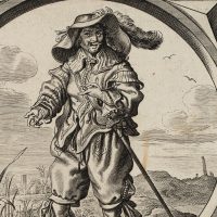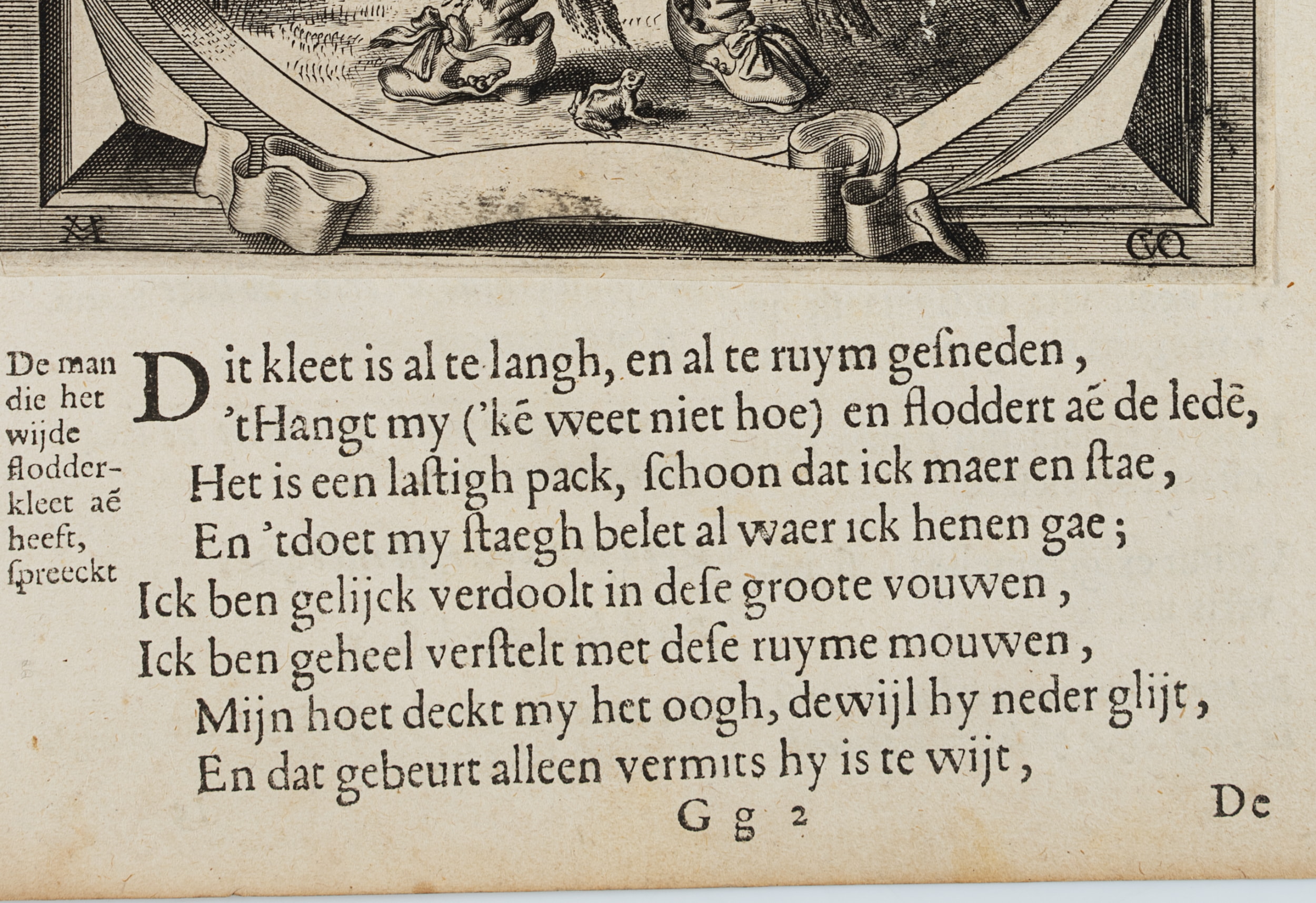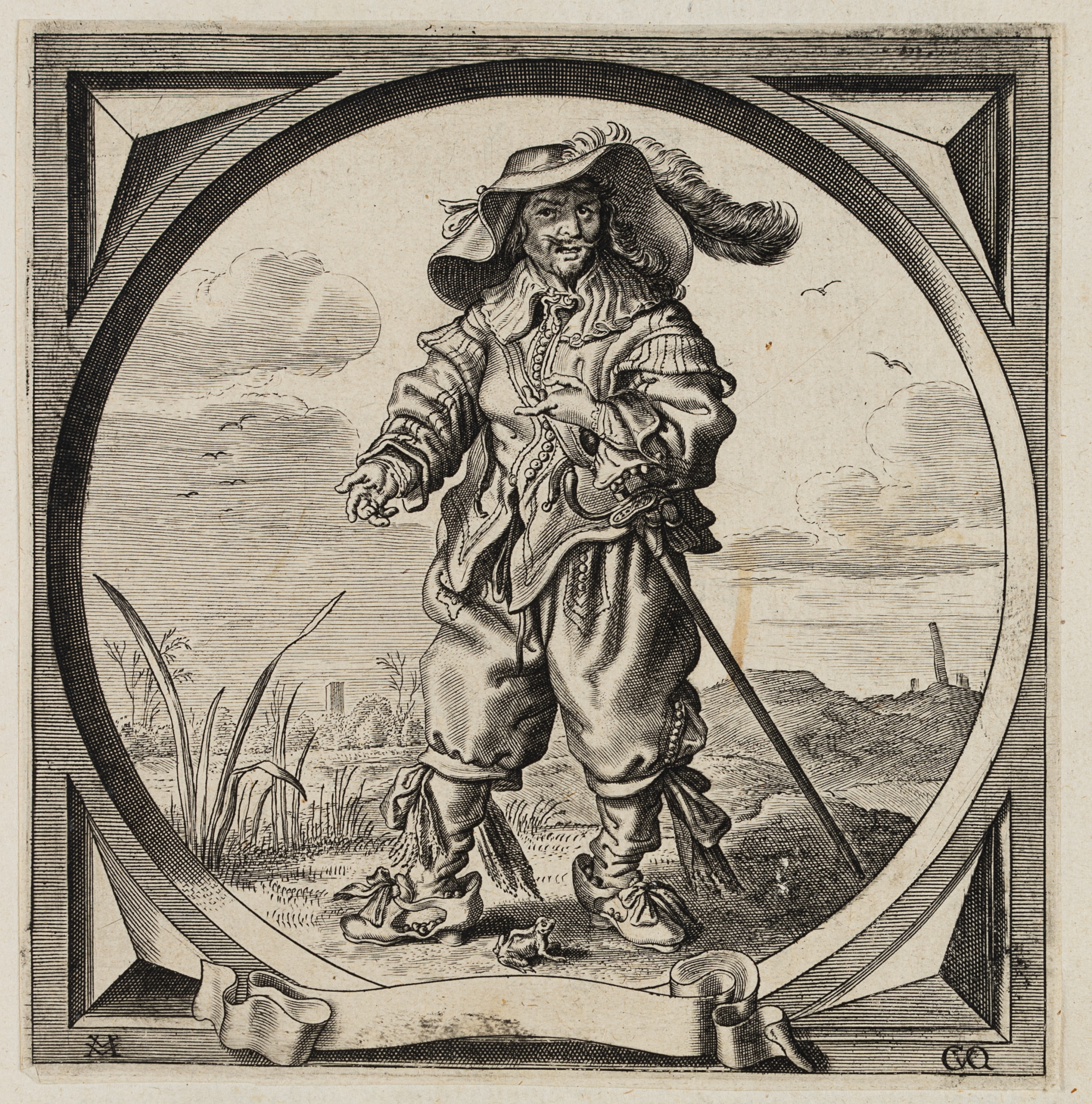 • Description: A man is at the centre of the depiction. He wears a fashionable hat and elegant, expensive contemporary clothes and shoes. At his feet sits a frog. The foreground is adorned by a kind of faceted stone decoration that provides a circular view of the scene. At the bottom of the picture are the artist’s and etcher’s monograms and a banner.