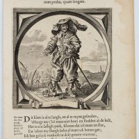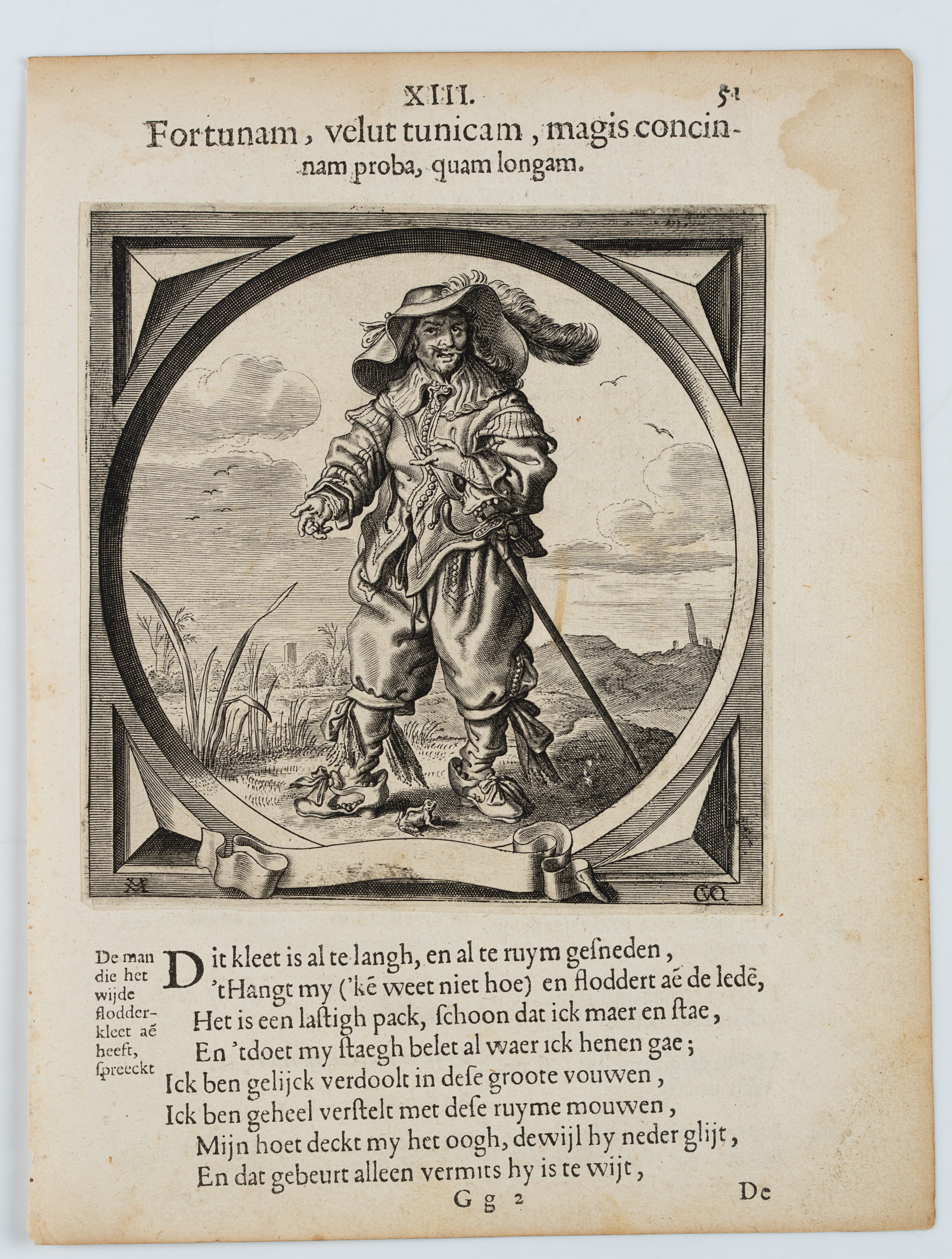 • Beschreibung: Ein Mann steht im Zentrum der Darstellung. Er trägt einen modischen Hut und elegante, teure zeitgenössische Kleidung und Schuhe. Zu seinen Füßen sitz ein Frosch. Der Vordergrund ist durch eine Art facettierte Steinverzierung geschmückt, die einen kreisrunden Einblick in die Szene gewährt. Am unteren Bildrand befinden sich die Künstler- und Radierer-Monogramme sowie ein Banner.