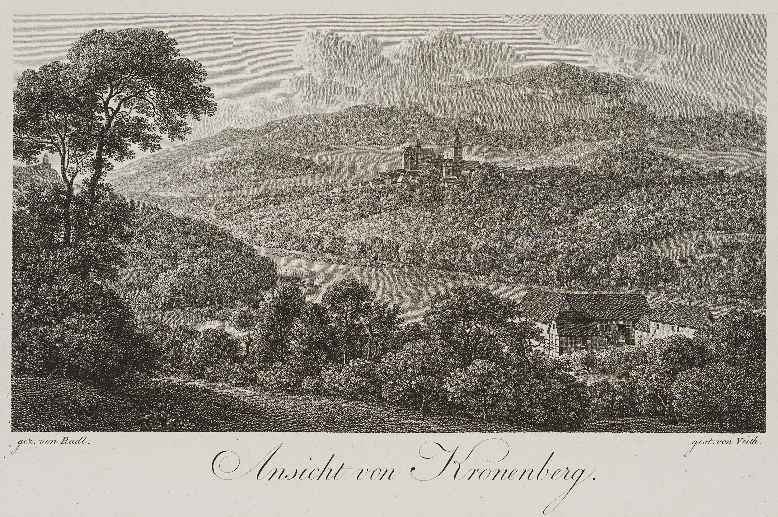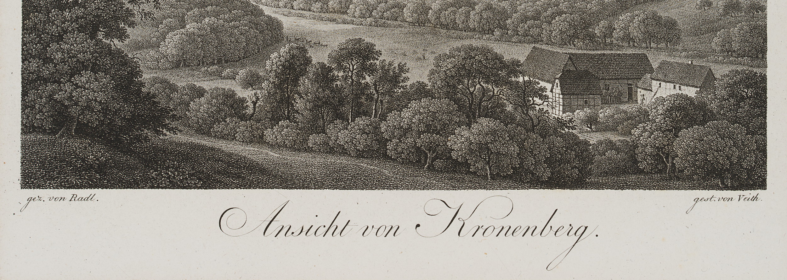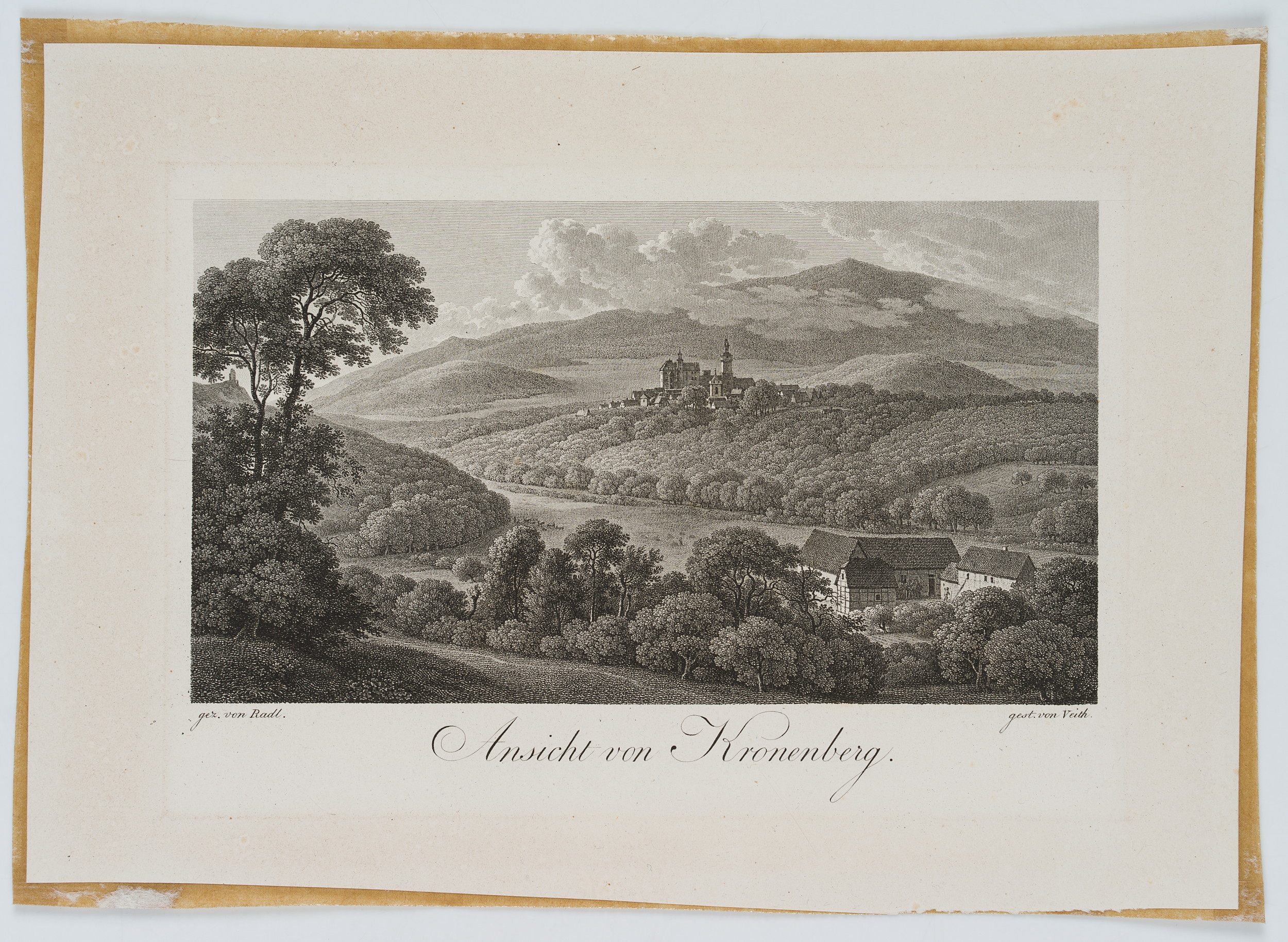 - Bezeichnung: Unten im Druck signiert: “gez. von Radl | gest. von Veith”. Unten im Druck bezeichnet: “Ansicht von Kronenberg”.