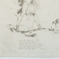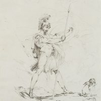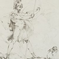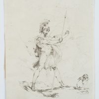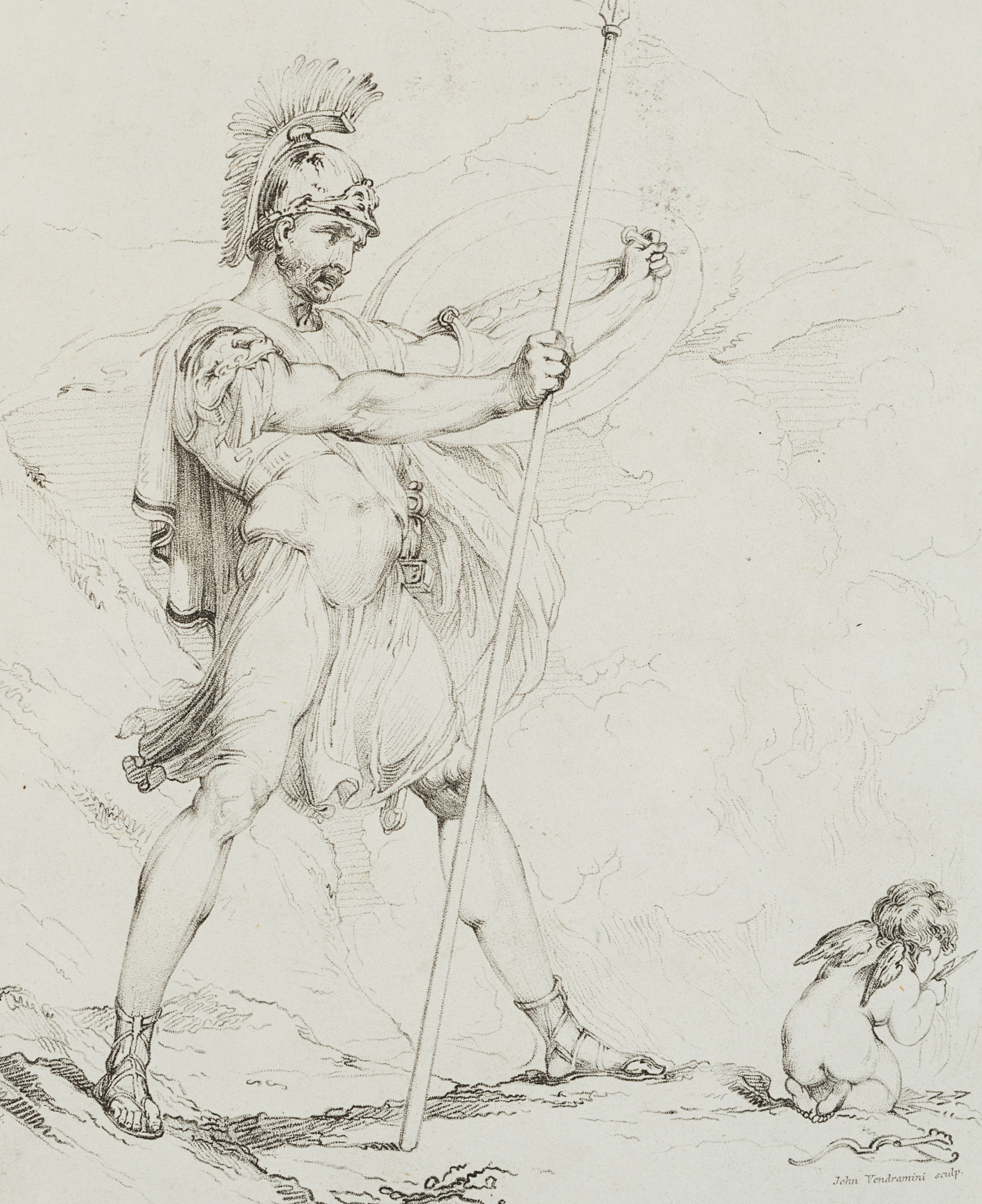 - Description: Illustration to the “Odes of Anacreon”, translated by Thomas Moore; a soldier stands with a spear in his right hand and a shield in his left. He is looking to the right. There Amor kneels, who has laid down his bow beside him and holds arrows in his hand.