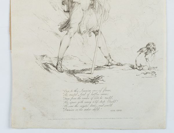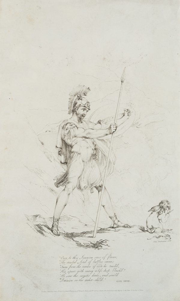 - Inscription: Lower middle signed in the printing plate: “Robert Ker Porter del. / John Vendramini sculp.”. Lower middle further inscription: “Once to this Lemnian cave of flame / The crested Lord of battles came / Twas from the ranks of war he rush’d / His spear with many a life-drop blush’d! / He saw the mystic darts, and smil’d / Derision on the archer-child / ODE XXVII”. Lower middle additional inscription: “London, Published June 4th 1803 by John P. Thompson, Gt. Newport Street and No. 51 Dean Street, Printseller to His Majesty, & the Duke and Duchess of York”.
