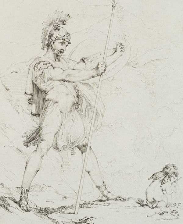 - Beschreibung: Illustration zu den “Oden des Anakreon”, übersetzt von Thomas Moore; ein Soldat steht mit dem Speer in der rechten und einem Schild in der linken Hand. Er blickt nach rechts. Dort kniet Amor, der seinen Bogen neben sich abgelegt hat und Pfeile in der Hand hält.