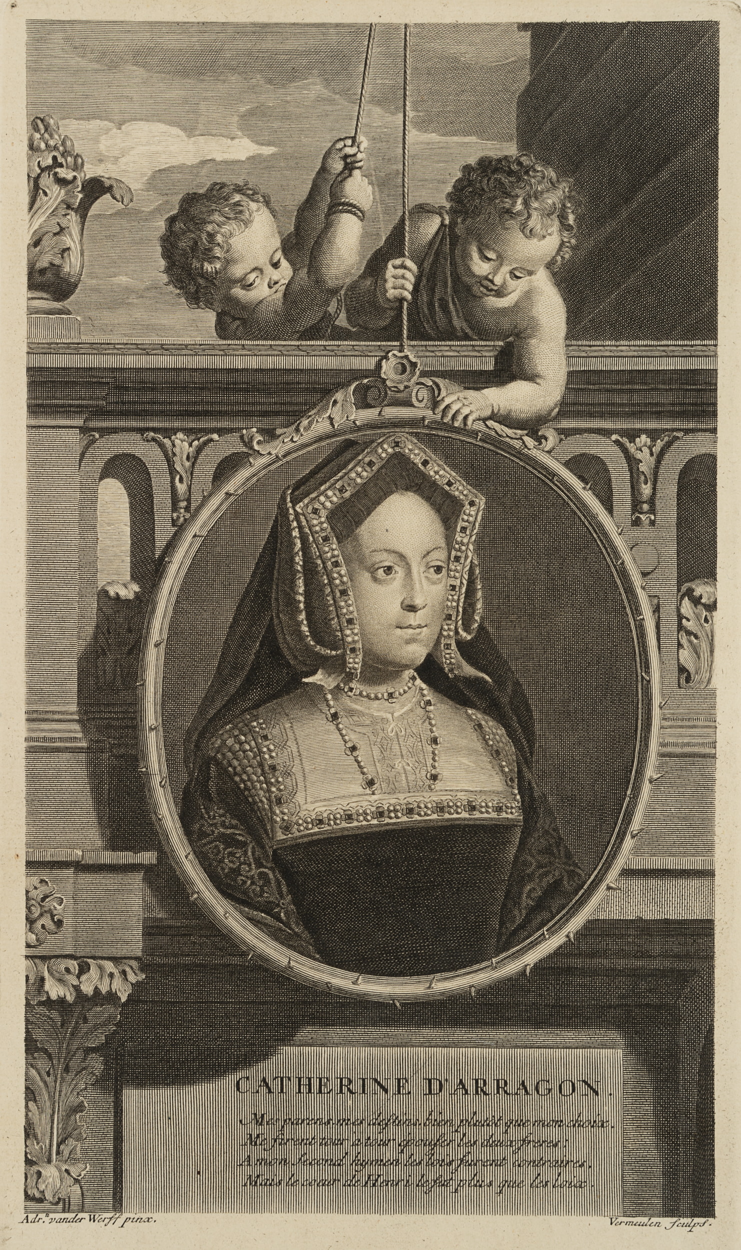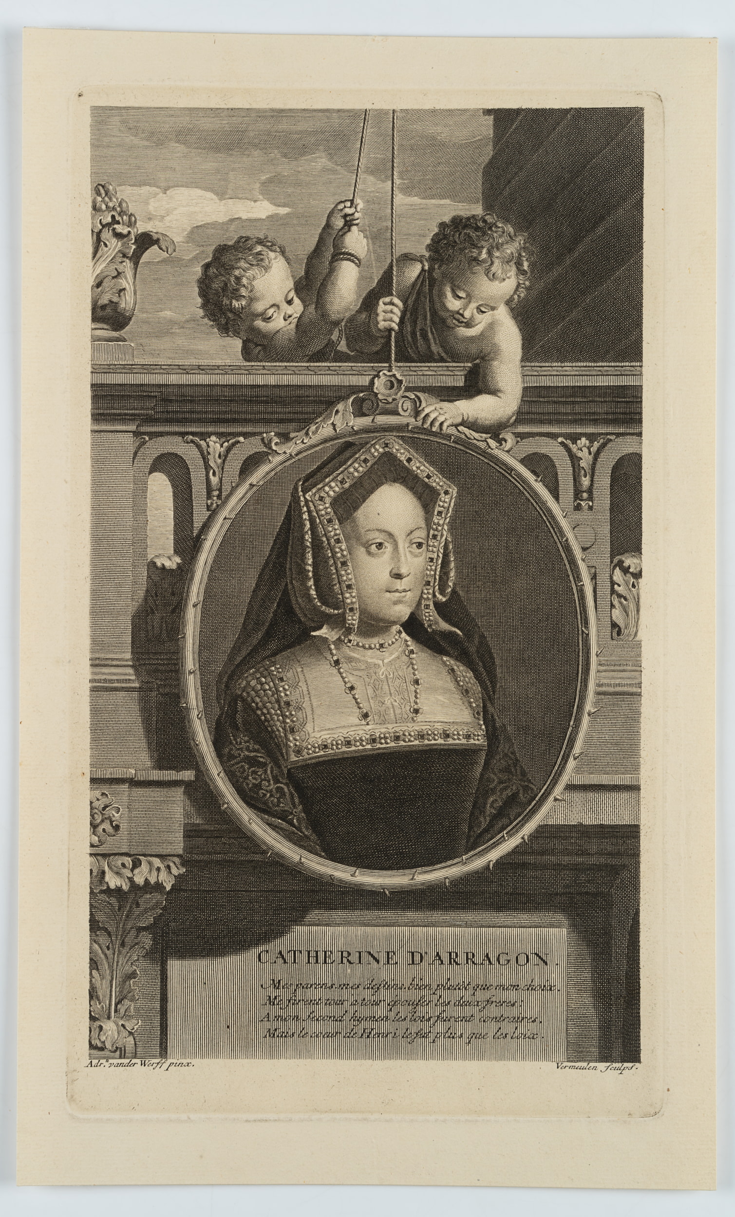 Cornelis Vermeulen (um 1644 Antwerpen – um 1708 ebd.) nach Adriaen van der Werff (1659 Rotterdam – 1722 ebd.), Porträt Katharina von Aragon (1485-1536), 18. Jahrhundert, Kupferstich