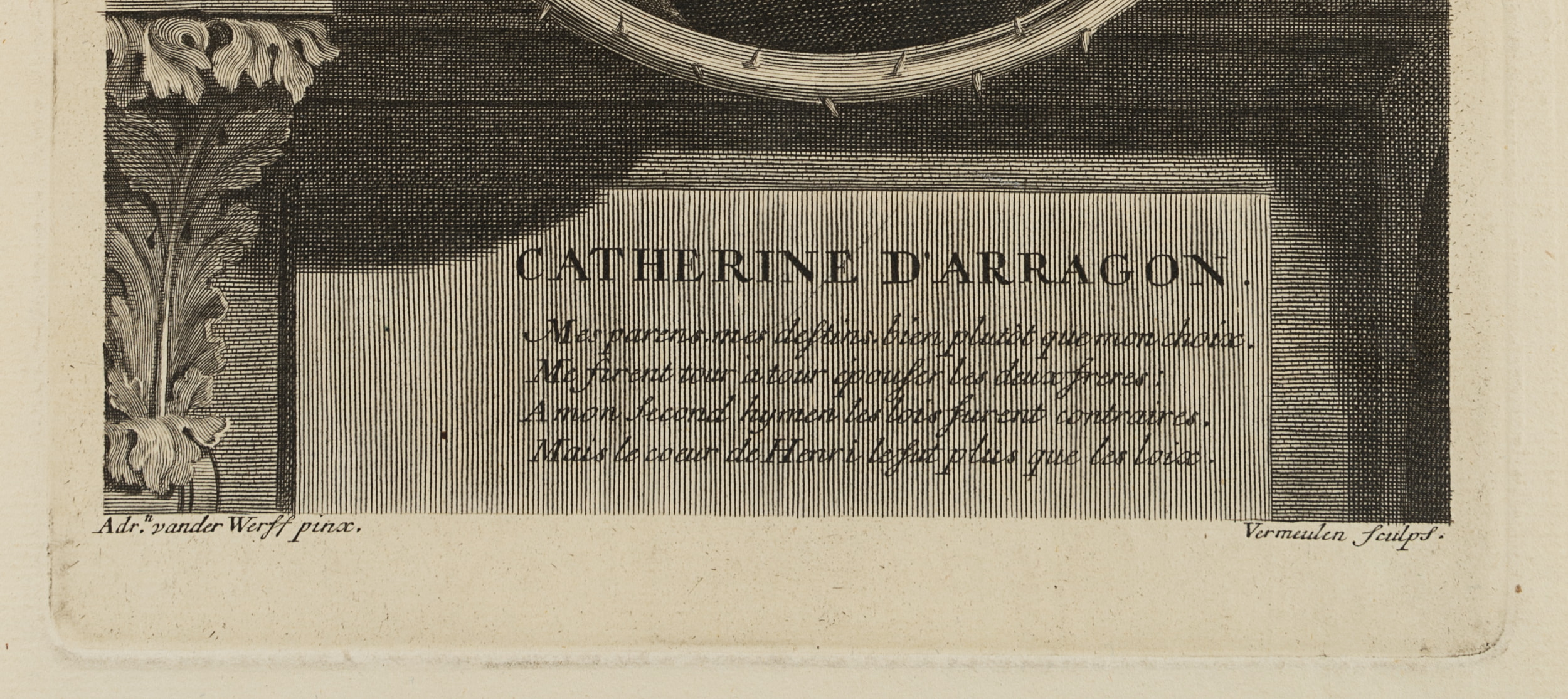 Cornelis Vermeulen (around 1644 Antwerp – around 1708 ibid.) after Adriaen van der Werff (1659 Rotterdam – 1722 ibid.), Portrait of Catherine of Aragon (1485-1536), 18th century, Copper engraving
