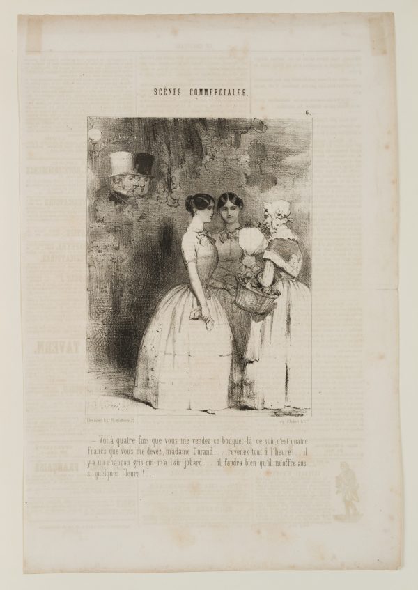 Caption. Translated from French: “You’ve already sold me a bouquet like this four times tonight – it’s four francs you owe me, Mrs Durand…. – Come back later….There’s a guy with a grey hat who seems like a simpleton to me…. He must be giving me some flowers too!” - Verso: Typographic printing, advertisements