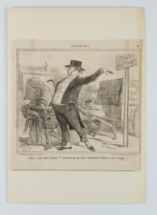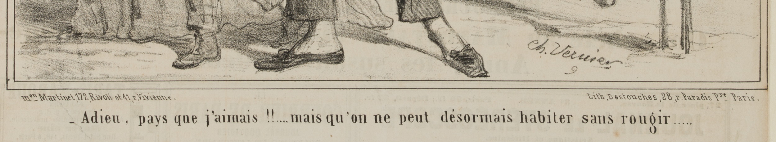 Caption. Translated from the French: “- Adieu, land I loved!….my homeland, which one can now no longer inhabit without blushing… [Vincent de Paul Bailly?] - Verso: Typographic printing, advertisements