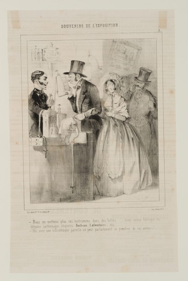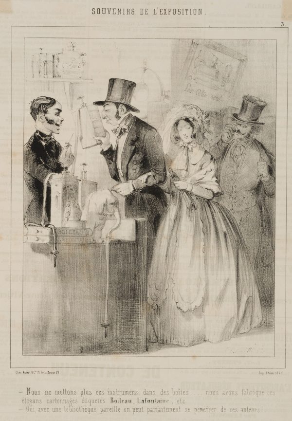 - Description: Caption. Translated from French: “- We no longer put these items in the box…. – We have these elegant cardboard boxes, labelled Boileau, Lafontaine, etc.