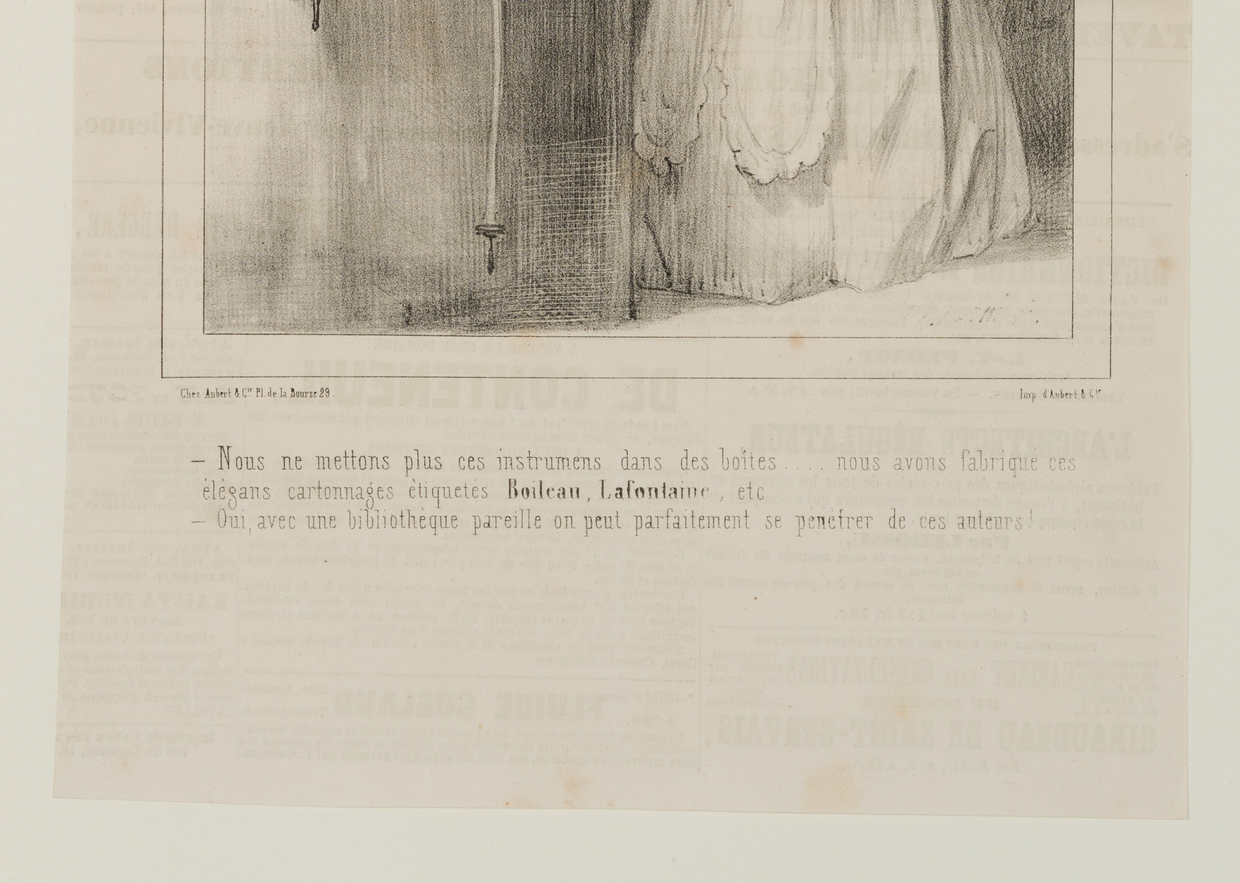 - Beschreibung: Bildunterschrift. Aus dem Französischen übersetzt: “- Wir legen diese Gegenstände nicht mehr in die Schachtel…. – Diese eleganten Kartonagen haben wir, mit Boileau, Lafontaine usw. etikettiert.