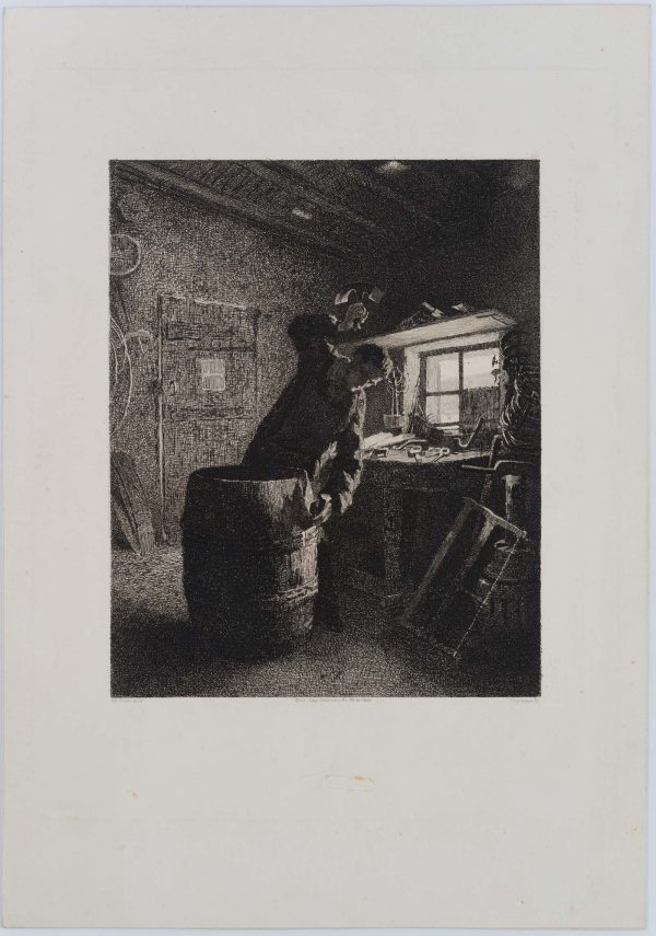 - Description: inscribed lower right “Veyrassat sc.”, inscribed lower left “Ed. Frère pinxt.”, blind stamp below the image. View into a dark workshop, illuminated only by a small window at the right edge of the picture. A workbench and numerous tools are visible. In the middle ground the owner of these tools is at work: a cooper is finishing his work on a wooden barrel. With his arm raised, he is about to strike the next blow with an axe.