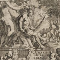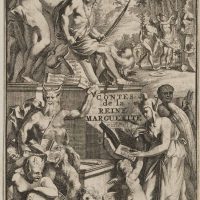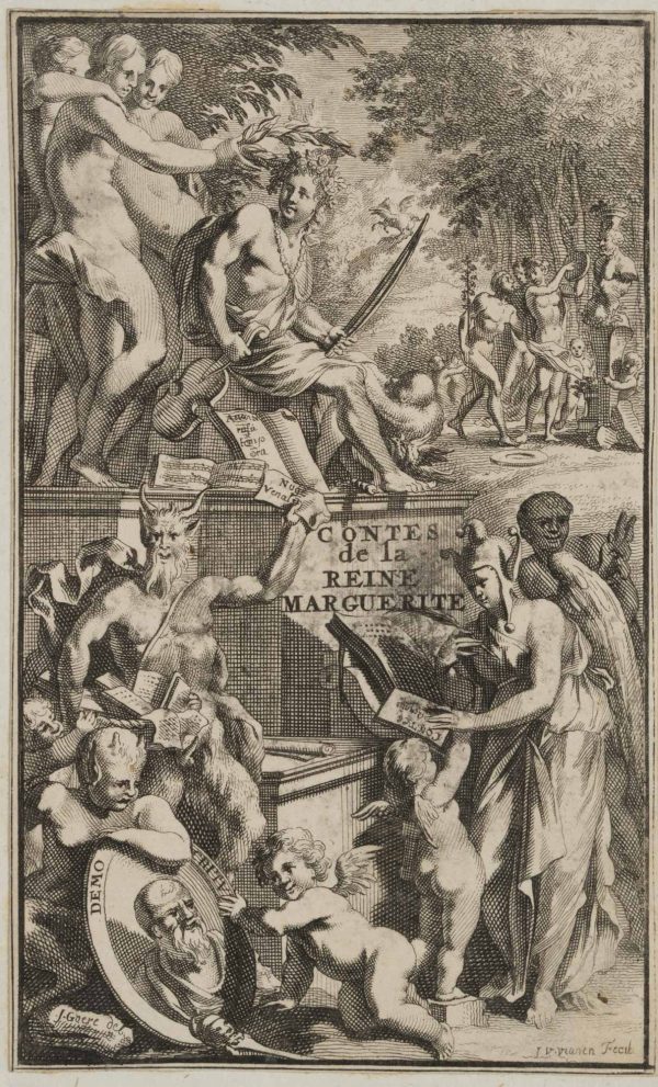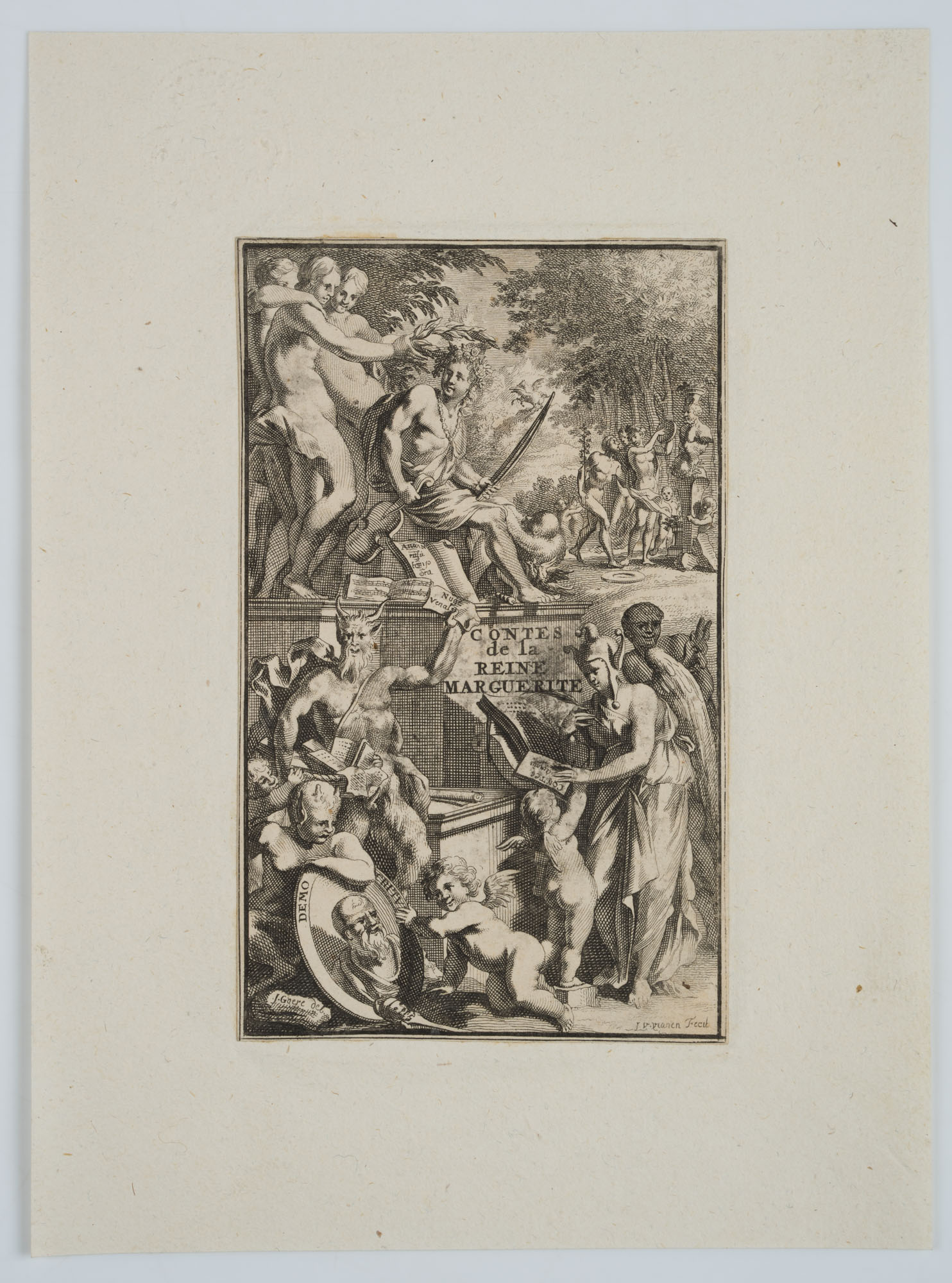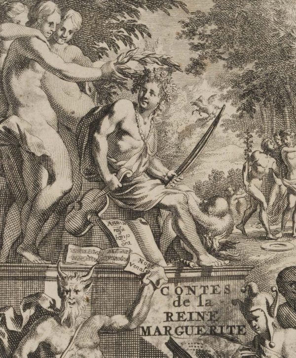 - Description: Antique divine feast with putti, centaurs and the three graces presenting a wreath to a youth playing the fiddle. On a pedestal in the picture the following inscription reads: “CONTES de la REINE MARGUERITE”.