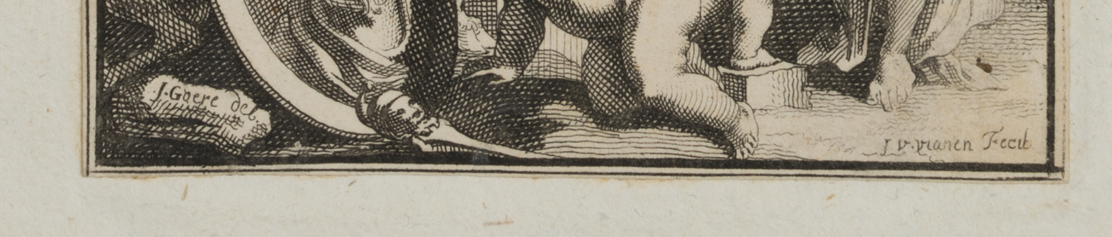 - Bezeichnung: Links unten signiert mit “J. Guere del” und rechts signiert mit “J. v. Vianen Fecit”.