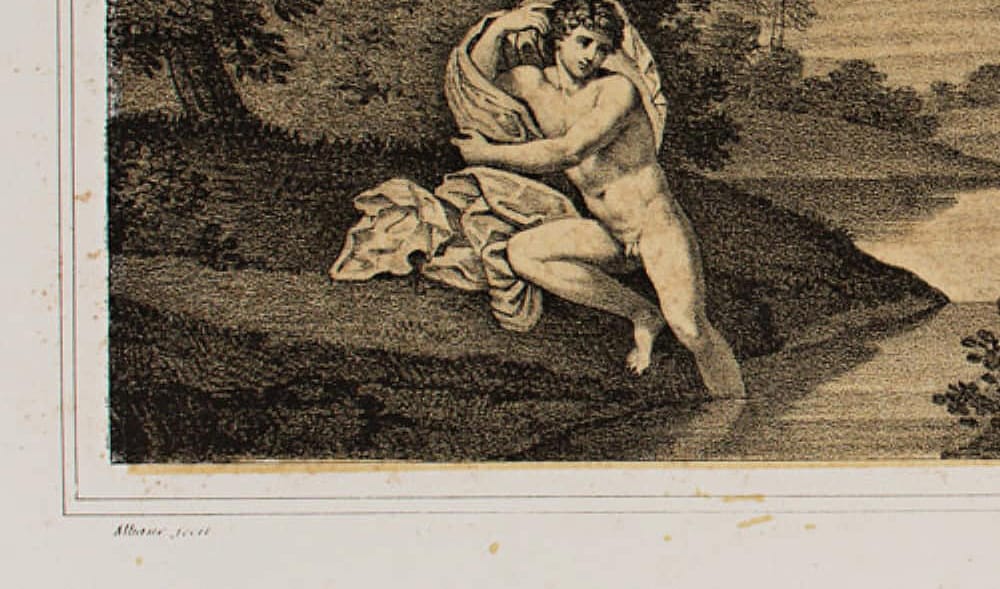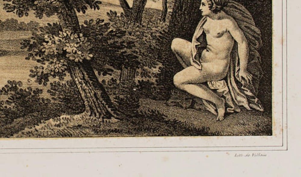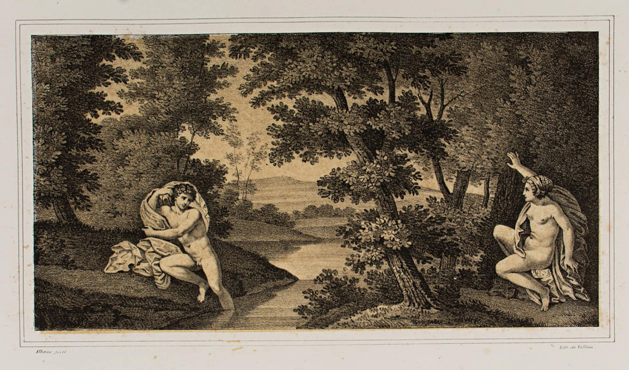 - Description: Aphrodite with the spring nymph Salmacis. Colour lithograph after a work by Francesco Albani, called Albane (1578-1660). He was a painter of the Romanesque School. Lithograph by Villain. From the series: Pictures of the Italian School (ECOLES D’ITALIE). Inscribed: Albane fecit. Lith de Villain.