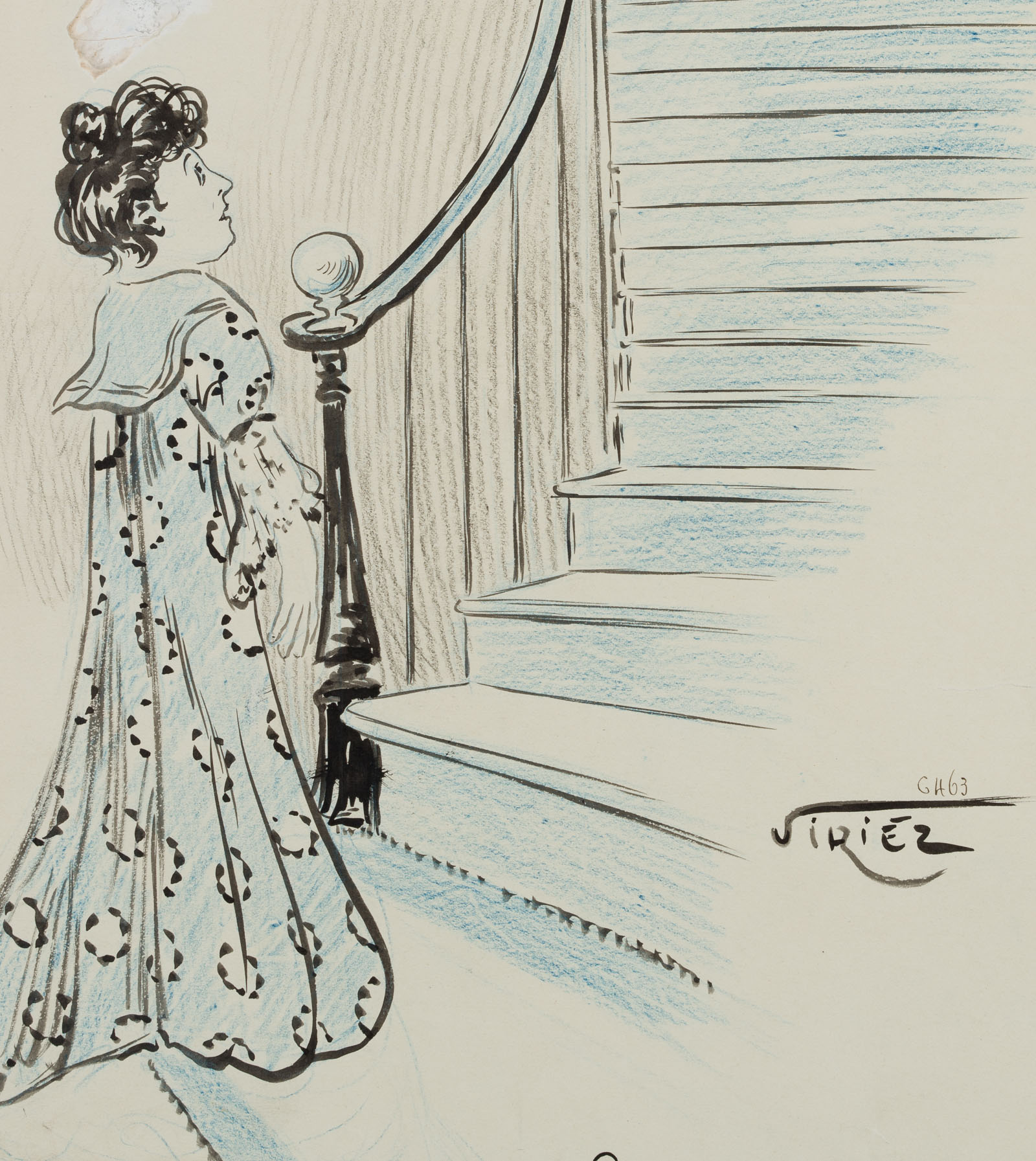 VIRIEZ (19.Jhd), Karikatur. Die Treppen, Tusche Jugendstil Karikatur
