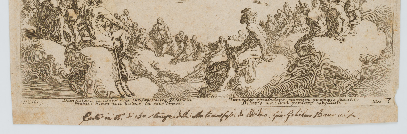 - Beschreibung: Unterhhalb in der der Druckplatte links mit Signatur des Stechers, mittig mit lateinischem Textzug und links nummeriert mit „libri 7“.