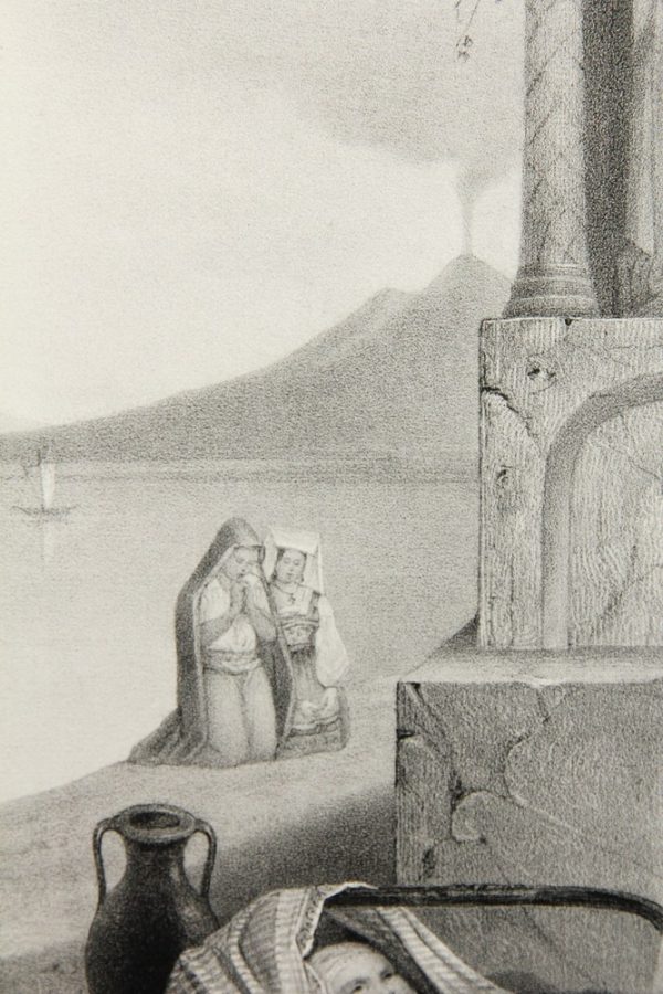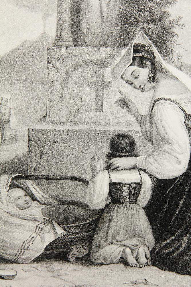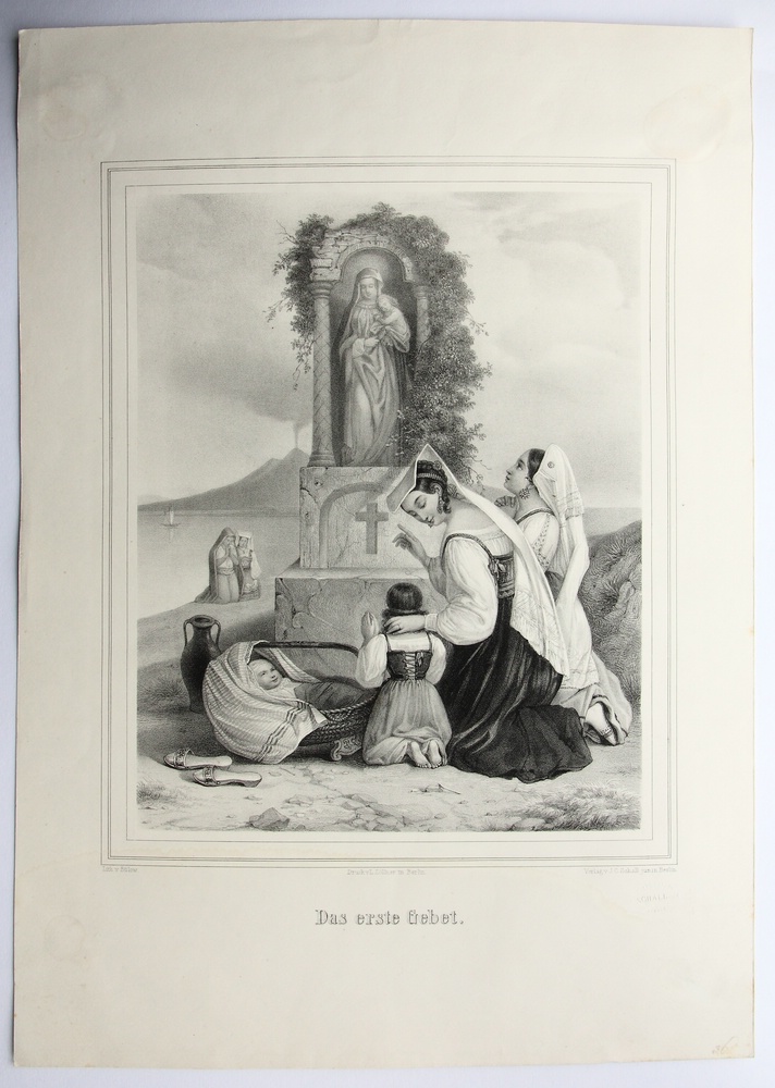 - Beschreibung: Ganzfigurige Ansicht zweier zum Gebet kniender junger Damen in süditalienisch wirkender Tracht mit einem Kleinkind und einem Säugling in einem Korb. Betende Frauen vor einem Madonnenbild an einer Küste mit ausbrechendem Vulkan im Hintergrund.