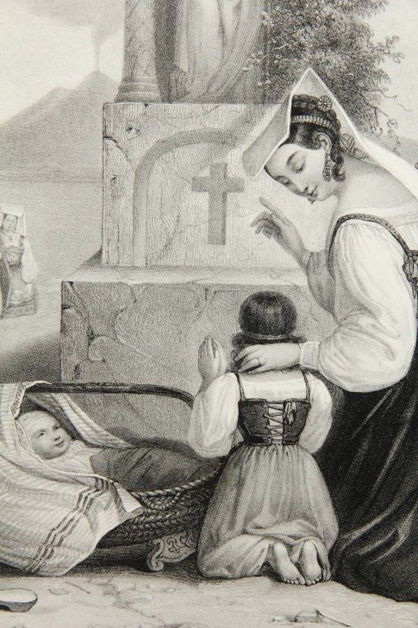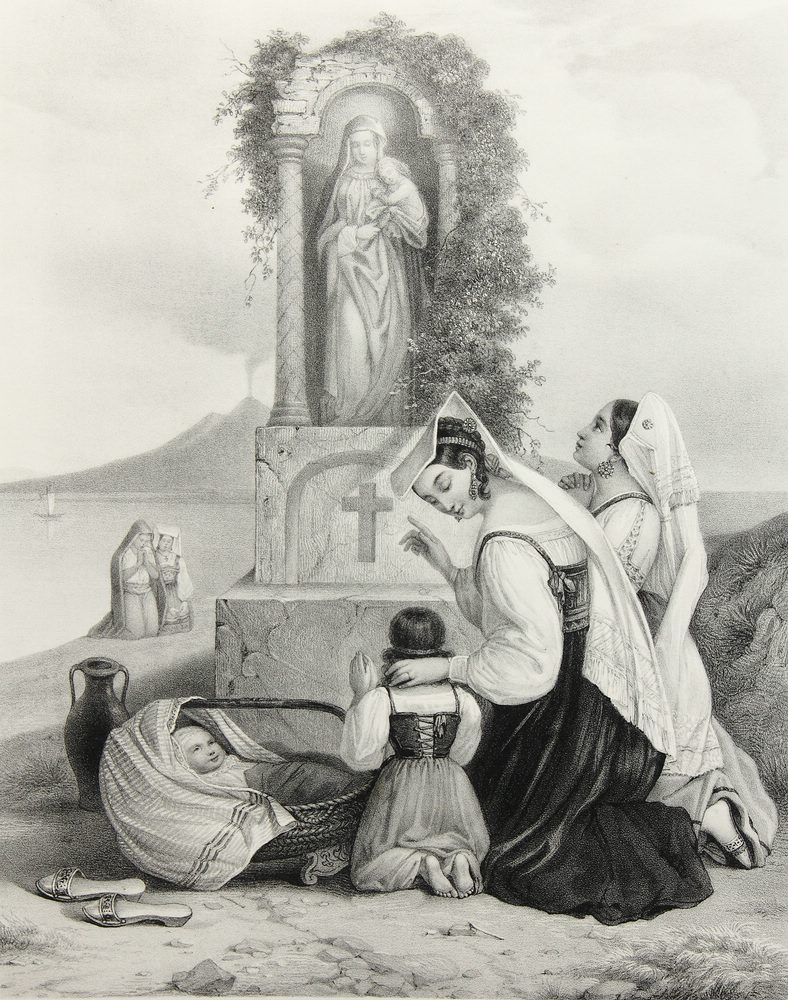 - Description: Full-length view of two young ladies kneeling in prayer, dressed in traditional costumes of southern Italy, with a toddler and an infant in a basket. Praying women in front of an image of the Madonna on a coast with erupting volcano in the background.
