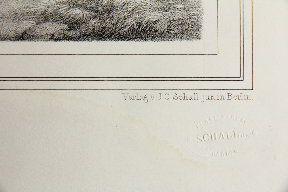 - Inscription: Signed and inscribed in the stone below the image. Printed by Kunst Verlag Schnall in Berlin. The blind stamp of the publisher can be seen on the right below the image.