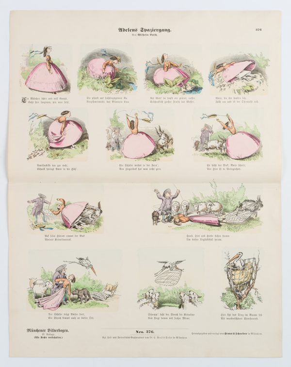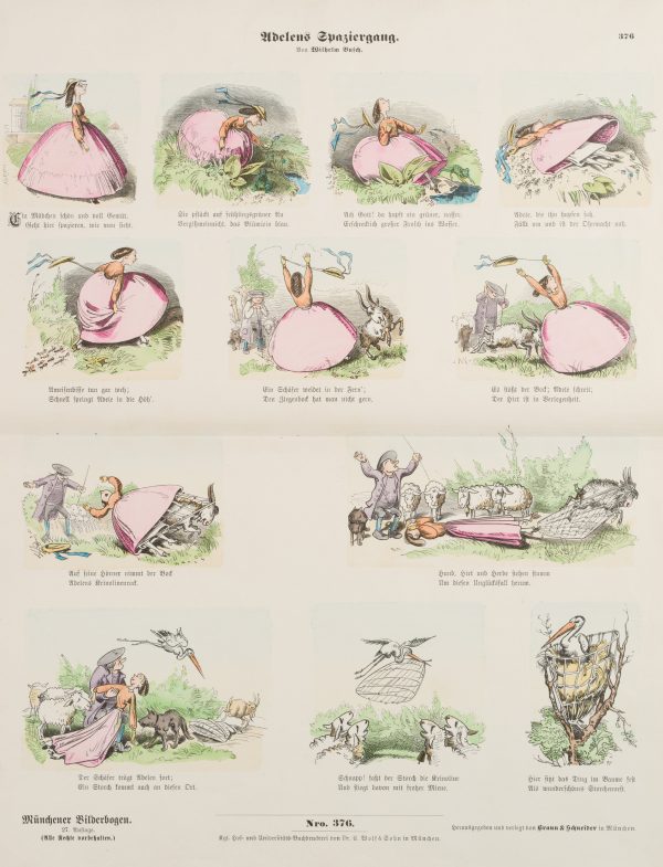 - Bezeichnung: Oben mittig im Druck bezeichnet: “Adelens Spaziergang. Von Wilhelm Busch. 376”.