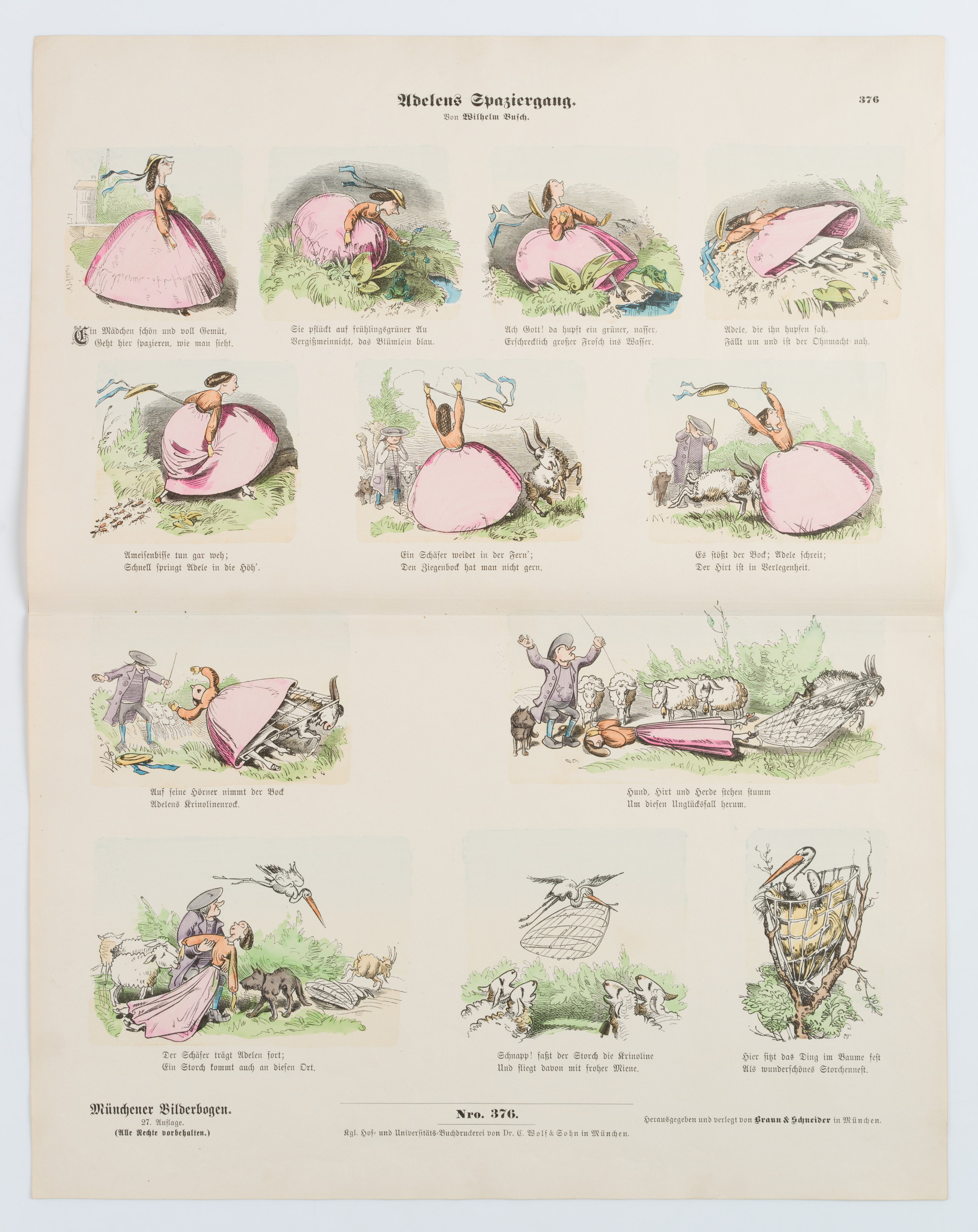- Inscription: Upper middle inscribed in the printing plate: “Adelens Spaziergang. Von Wilhelm Busch. 376”.