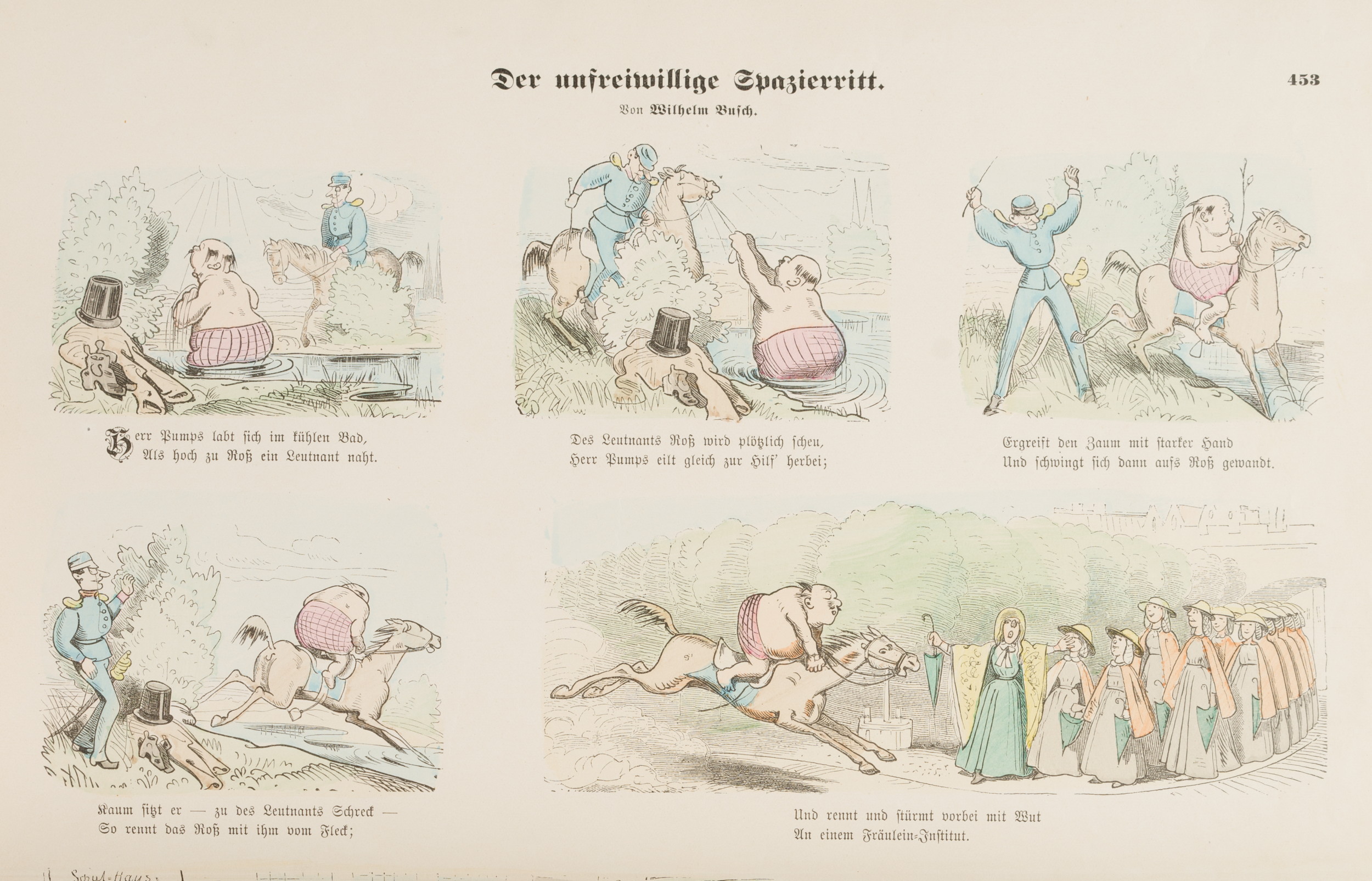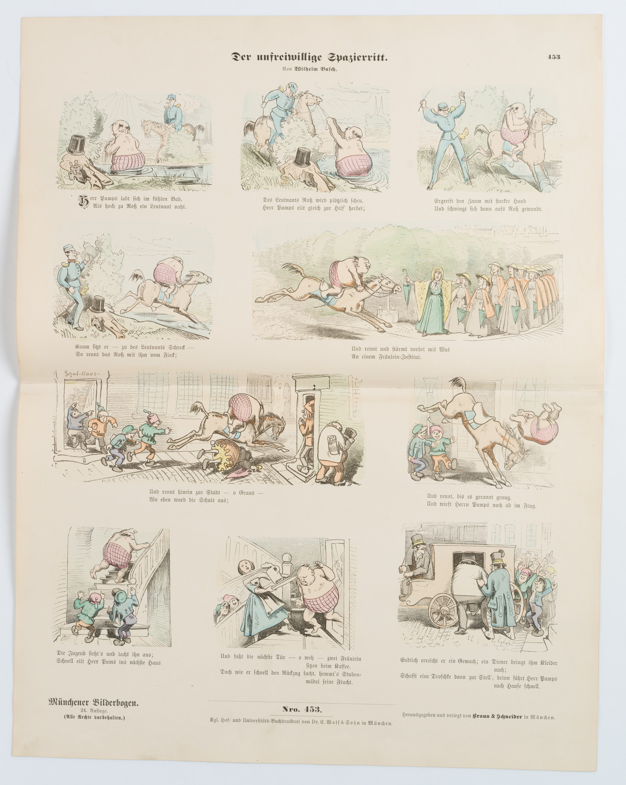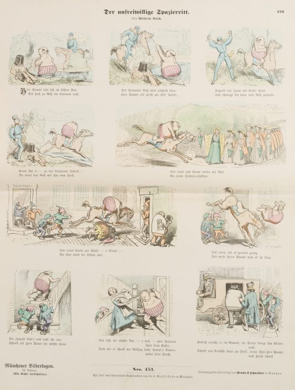 - Inscription: Upper middle inscribed in the printing plate: “Der unfreiwillige Spazierritt. Von Wilhelm Busch. 453”.