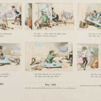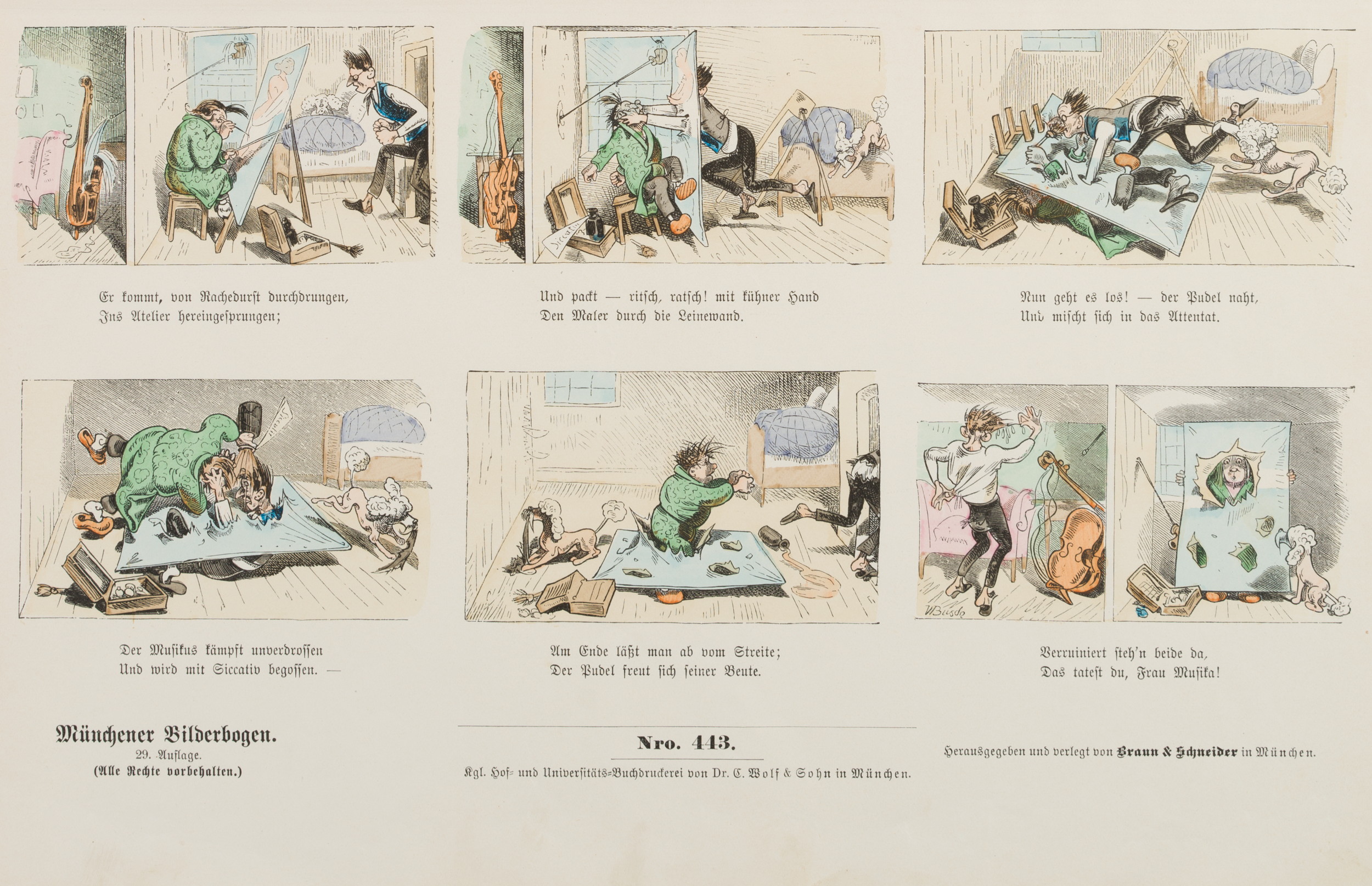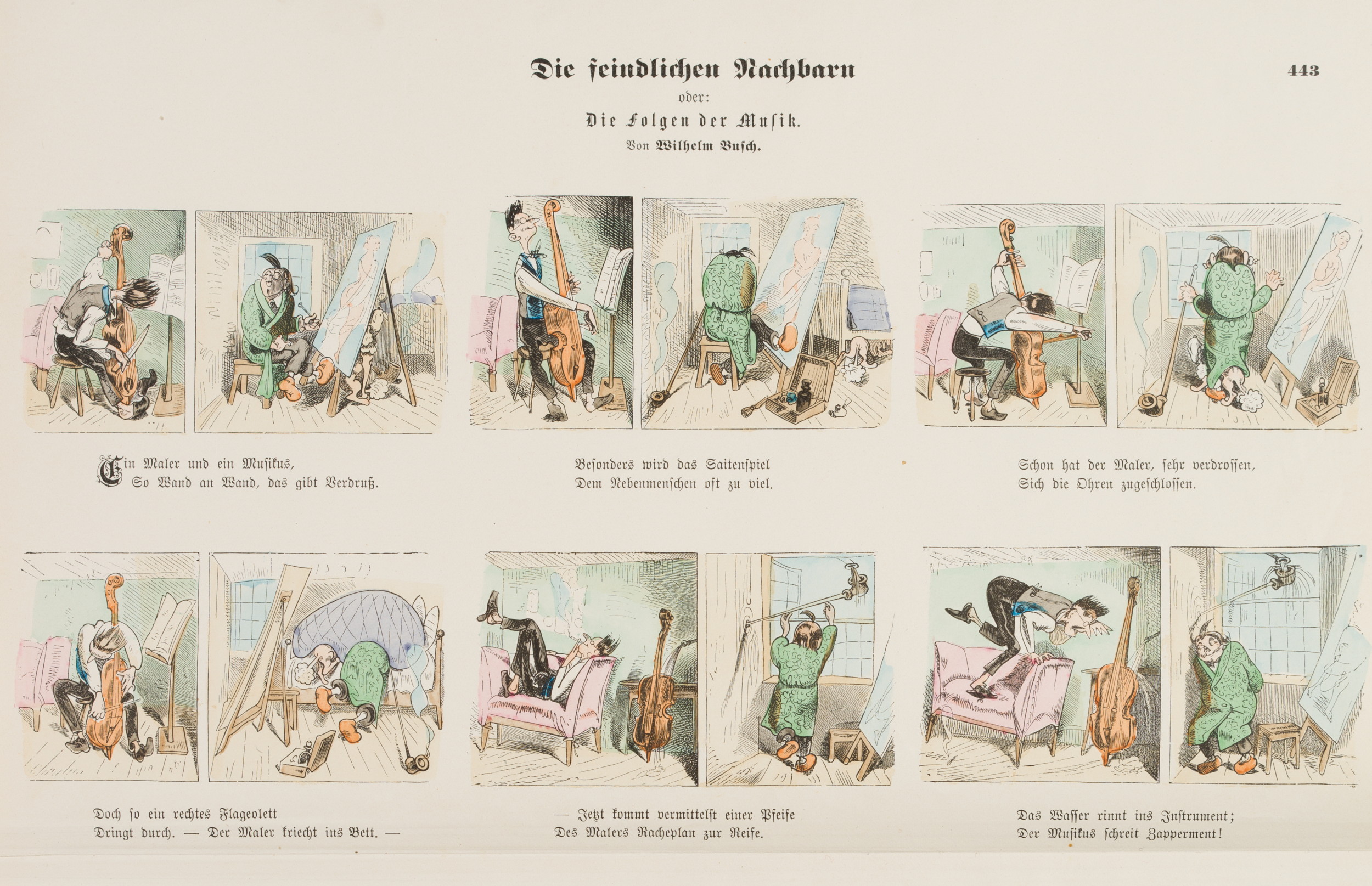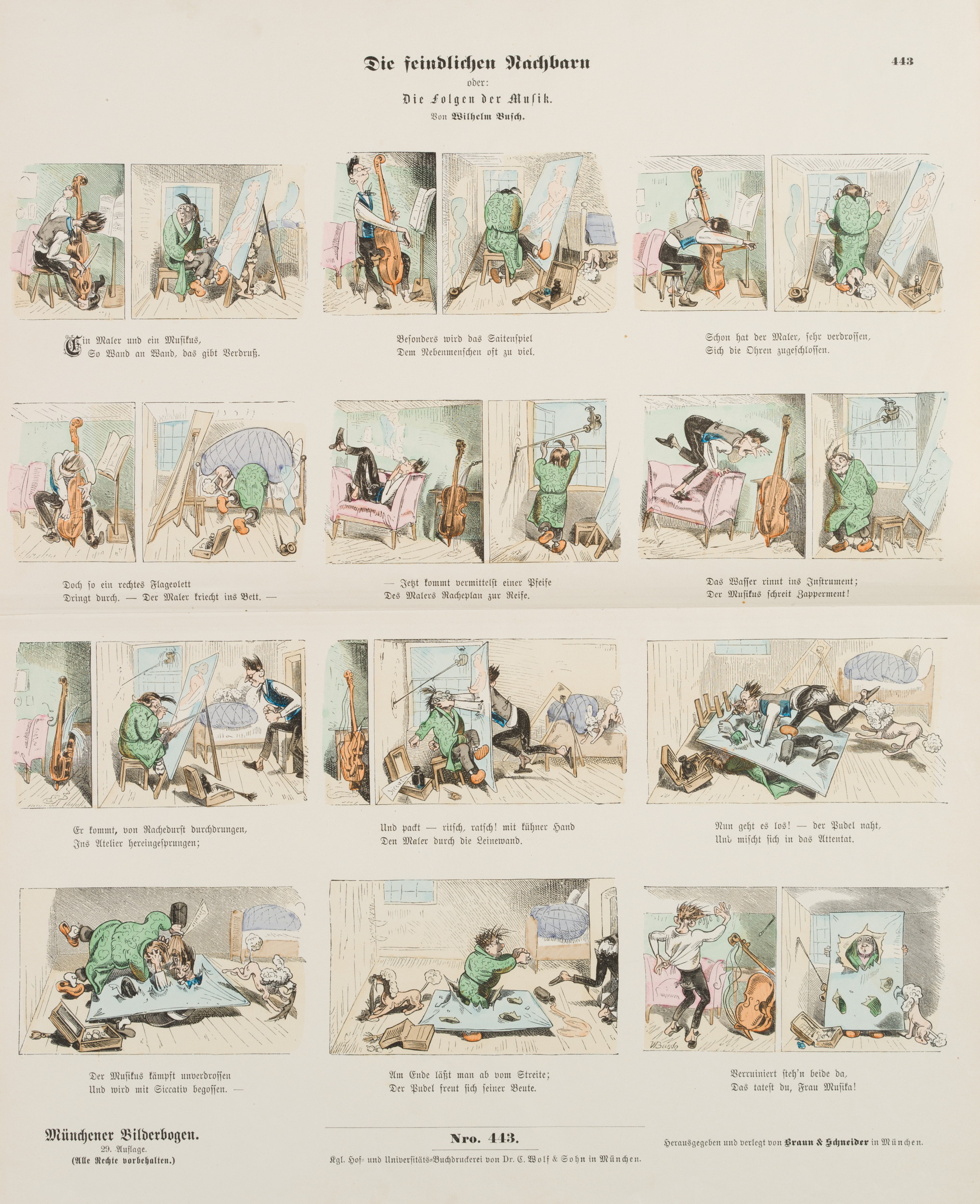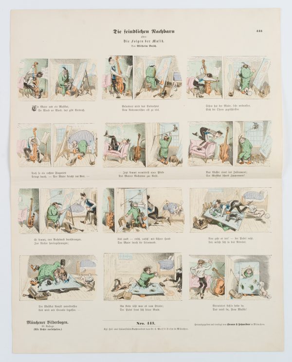 - Inscription: Upper middle inscribed in the printing plate: “Die feindlichen Nachbarn oder: Die Folgen der Musik | Von Wilhelm Busch | 443”. Lower middle numbered in the printing plate: “Nro. 443”.
